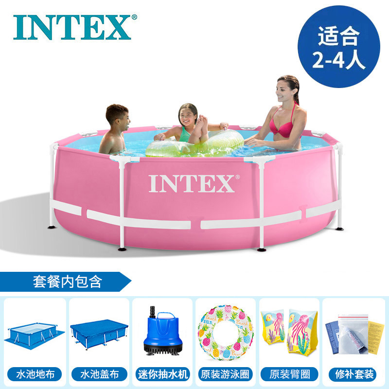 Розовый круглый intex 2,44X 0.76m (с тканевой крышкой, комплектом кольца для плавания с водяным насосом)