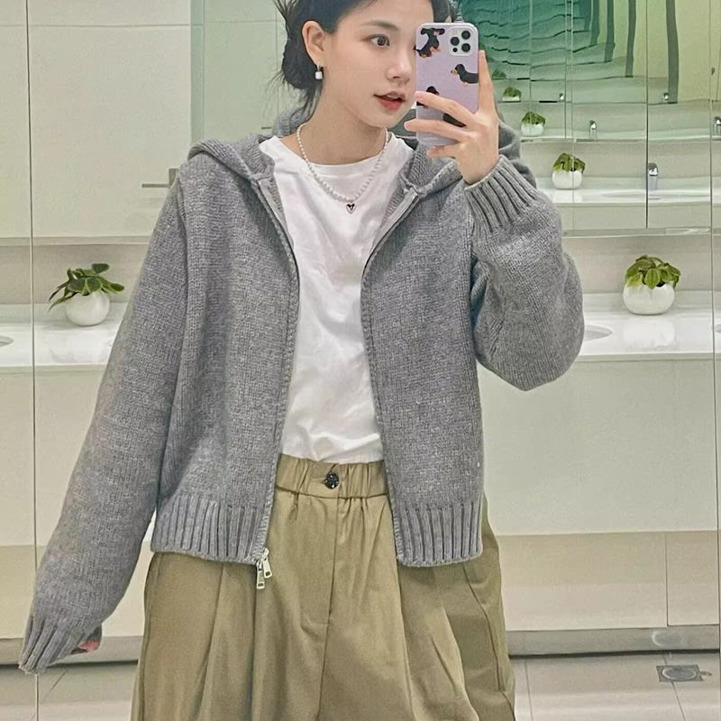 Главная страница > Серый свитер с капюшоном двойной застежкой-молнией куртка женский рано осенью 2024 новый стиль ретро ленивый ветер свободный вязаный кардиган