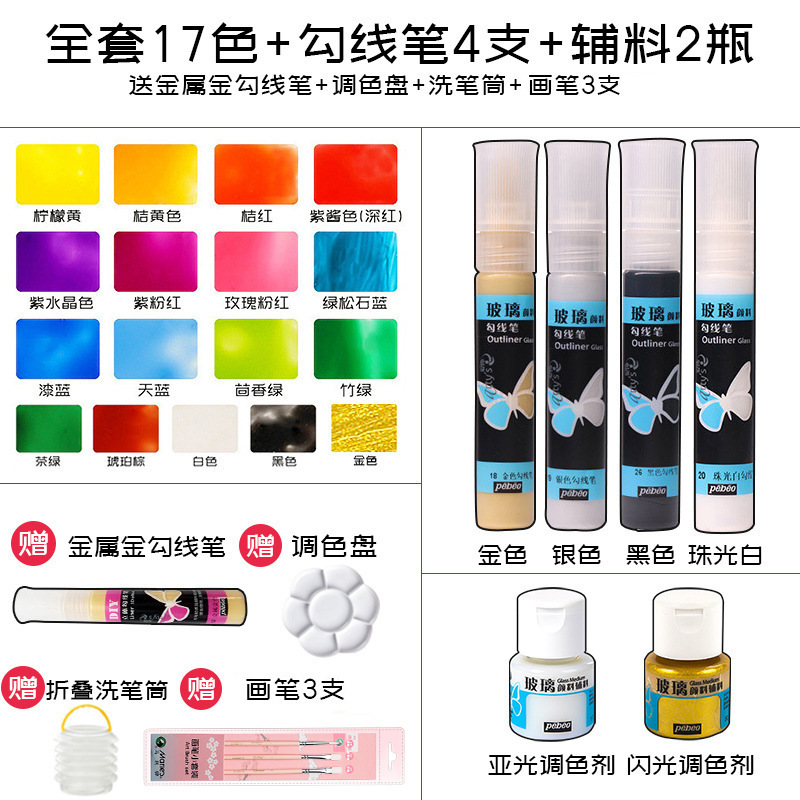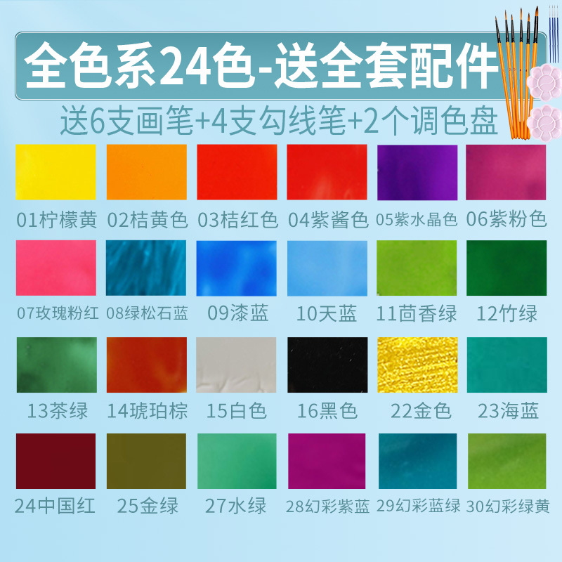 Полный набор из 24 цветов [Glass Paint] включает 6 кистей, 4 ручки-крючки и 2 цветовые палитры.