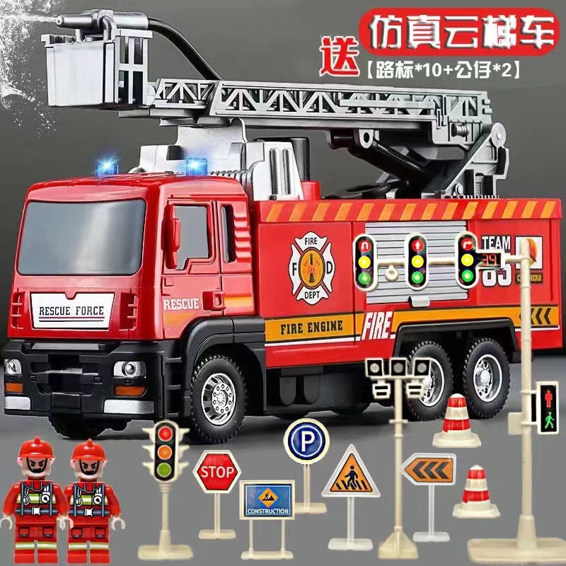 Пожарная машина с лестницей из сплава [Свет + музыка] может распылять воду + 2 человека + 10 дорожных знаков