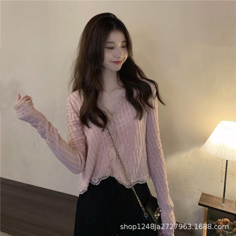 Главная страница > Сладкий шикарный кардиган с длинными рукавами рубашка женская весна лето новый нишевые дизайн кружевной край с V-образным вырезом короткий топ