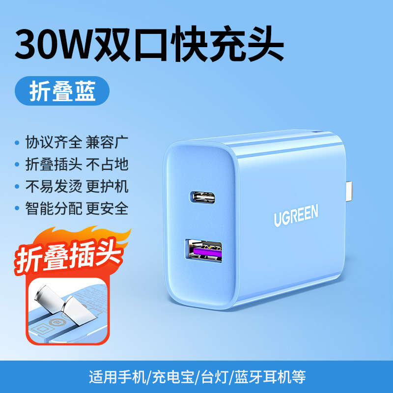 30 Вт丨Двухпортовый USB+PD丨Складной-синий