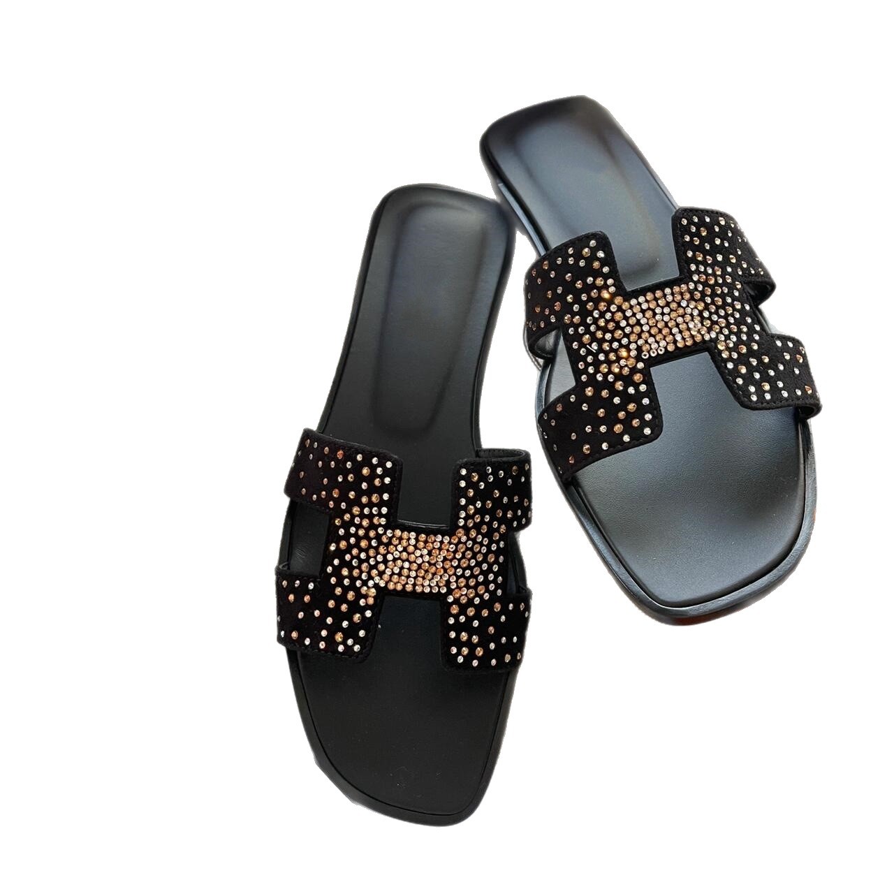 Главная страница > Полные высококачественных тапочек с блестящими стразами для женщин, лето 2025, новый стиль, из натуральной кожи, повседневные универсальные балетки-сандалии