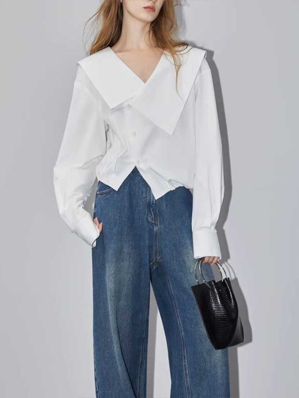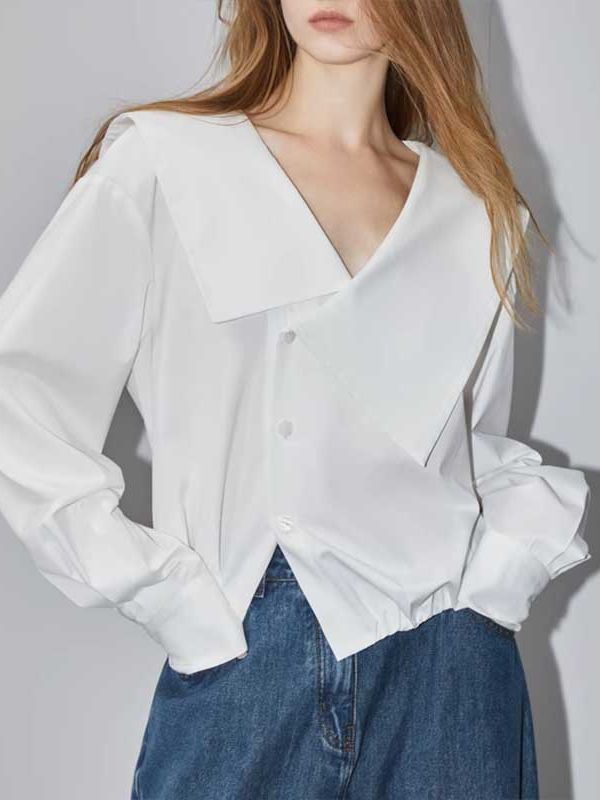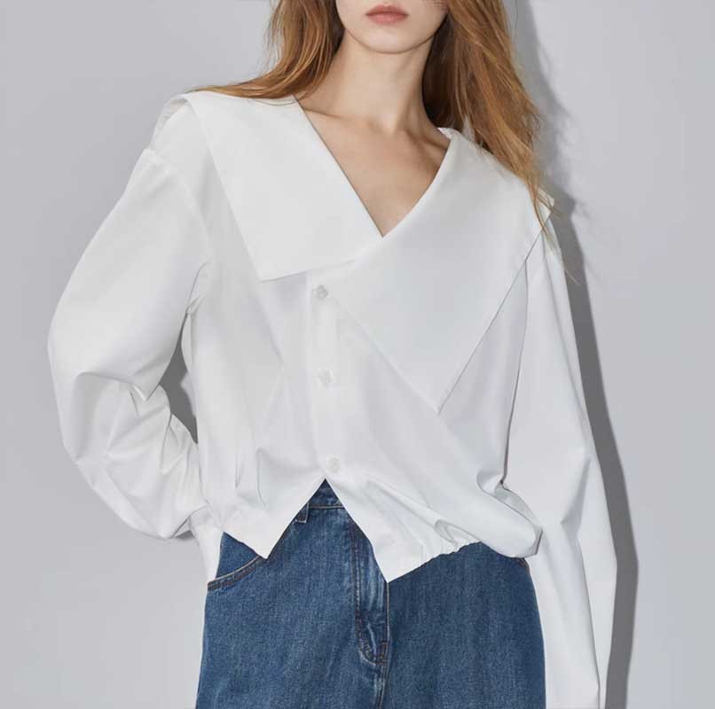 Главная страница > Белая женская рубашка в французском стиле с асимметричным большим воротником, новая модель осени 2023 года, простой и уникальный топ с длинными рукавами.
