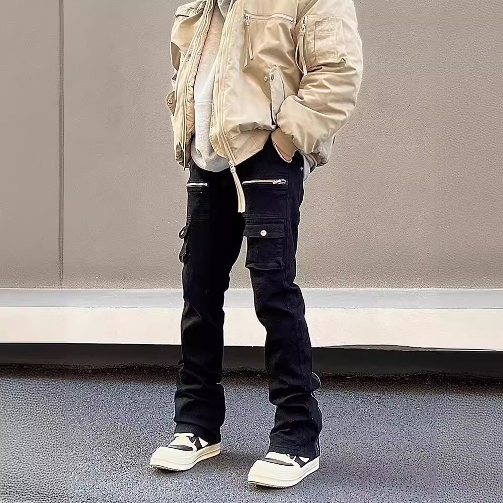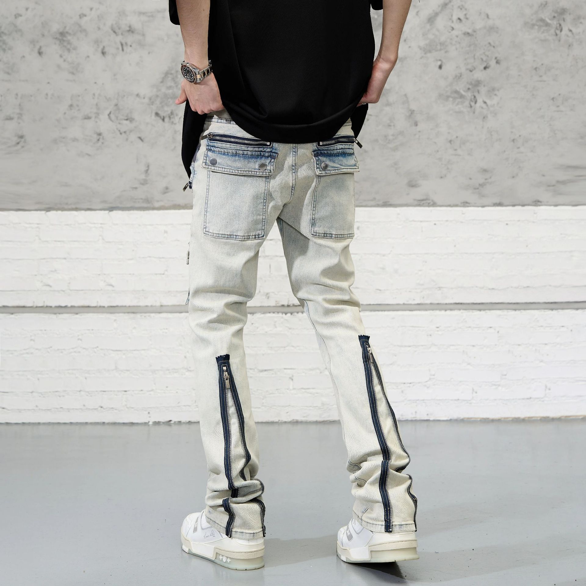 BAGGY JEANSM Американский ретро многокарманные эластичные джинсы мужской дизайн молния желтый грязевые брюки