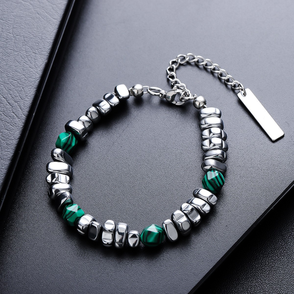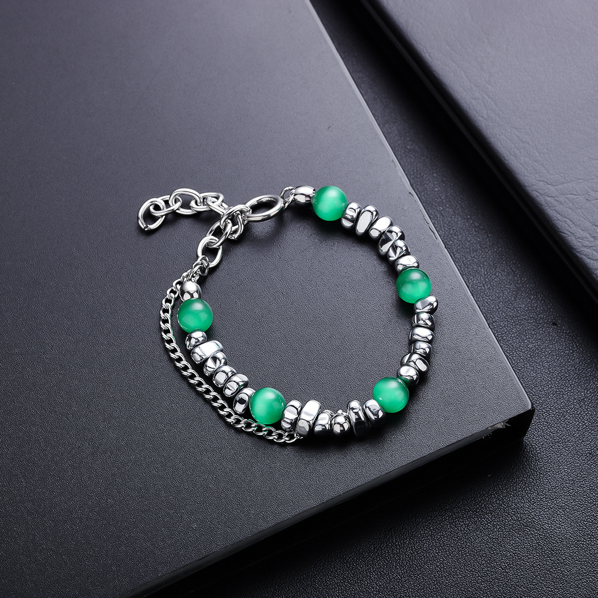 S067-A (браслет из титановой стали с зелеными бусинами)