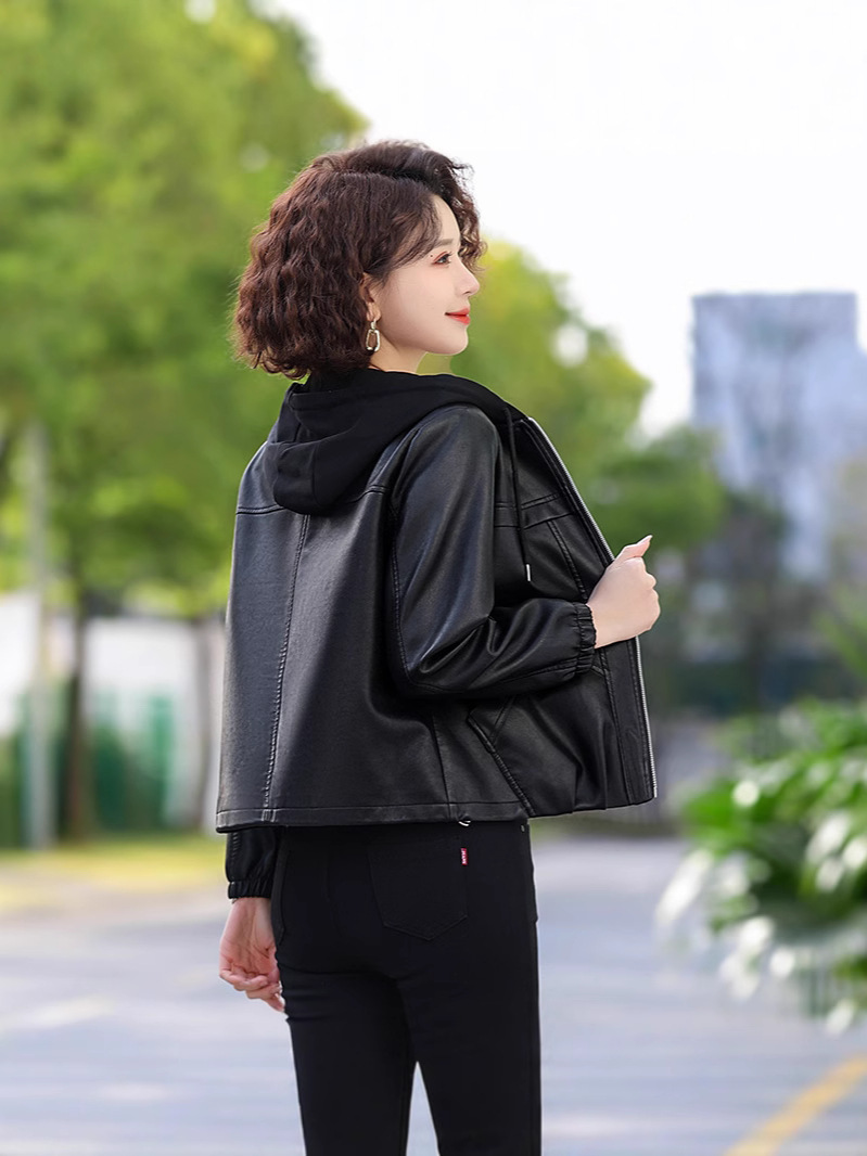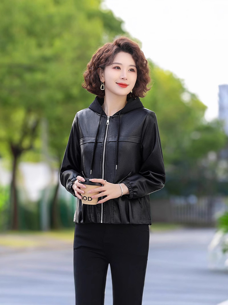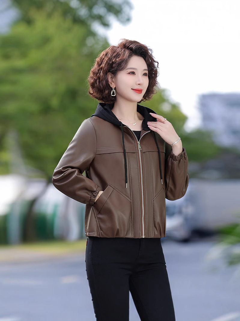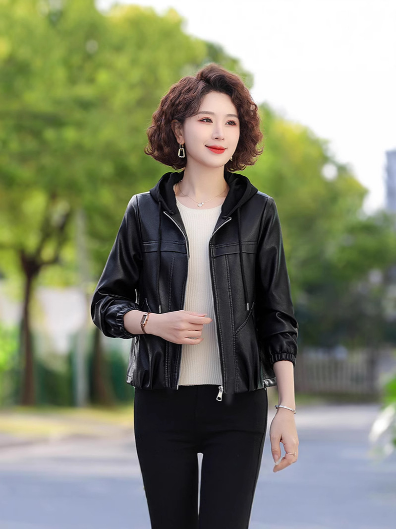 Главная страница > Короткая кожаная куртка Haining для женщин среднего и старшего возраста, маленький размер, весенне-осенний стиль 2025 года, кожаная куртка с капюшоном для мам.