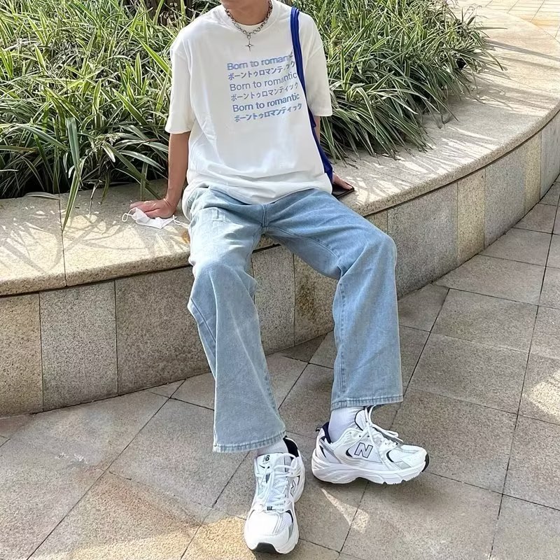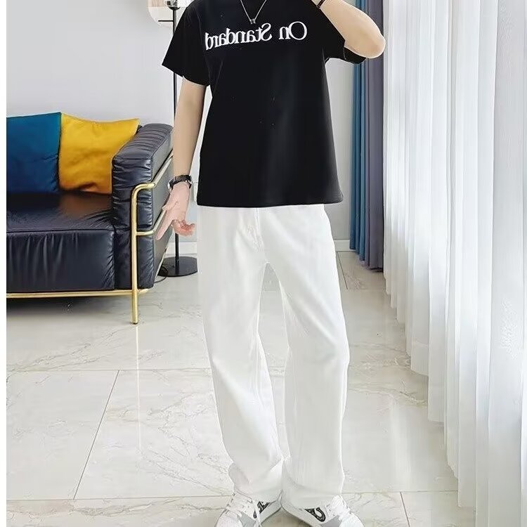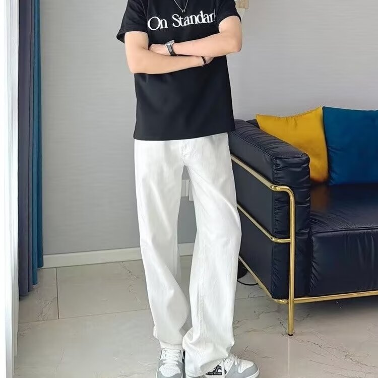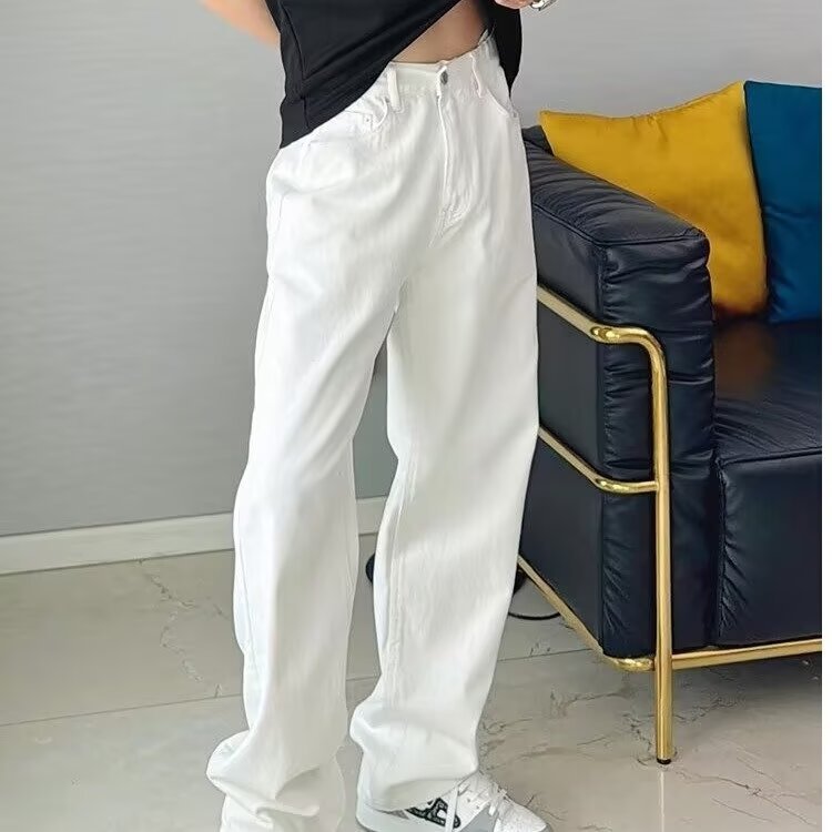 Главная страница > Белые джинсы в гонконгском стиле для мужчин осенью, модный бренд, элитные уличные повседневные простые свободные драпированные широкие прямые брюки