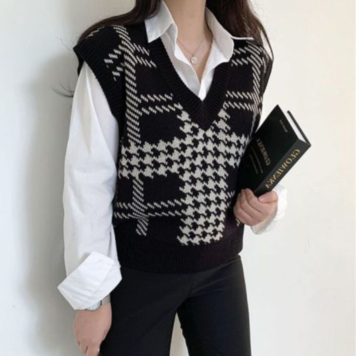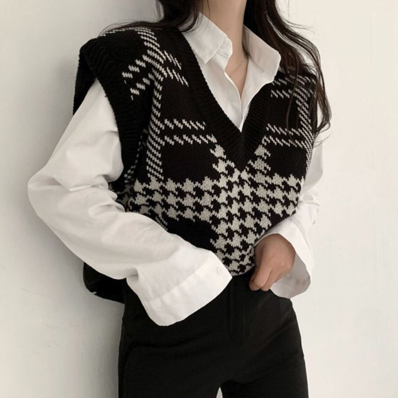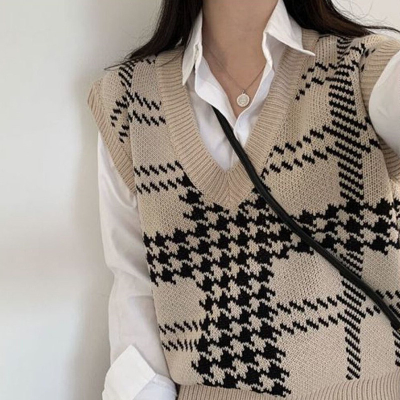 Главная страница > Большой клетчатый вязаный жилет без рукавов в ленивом стиле в Корейском стиле с V-образным вырезом, женский осенне-зимний наборный пуловер, клетчатый свитер, жилет
