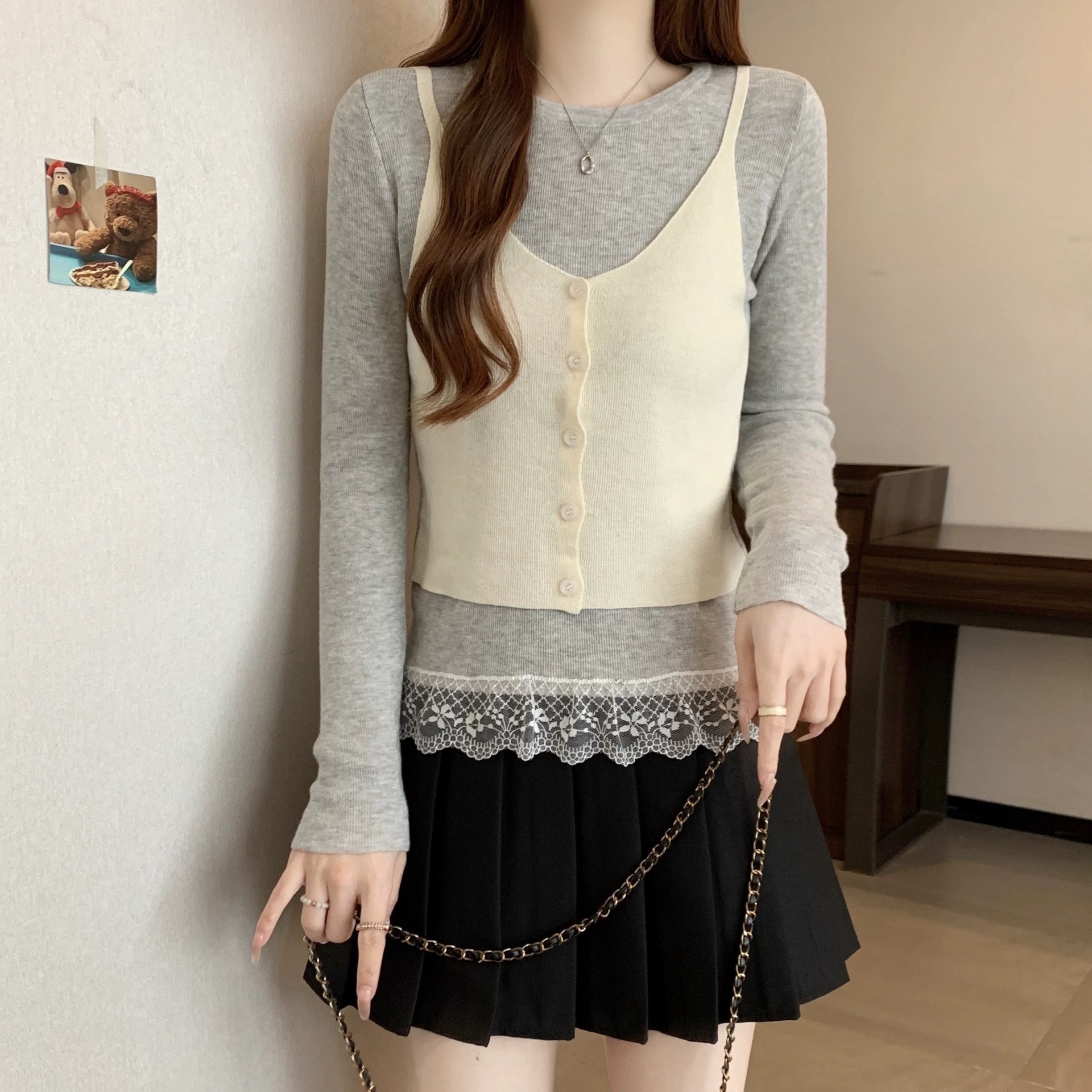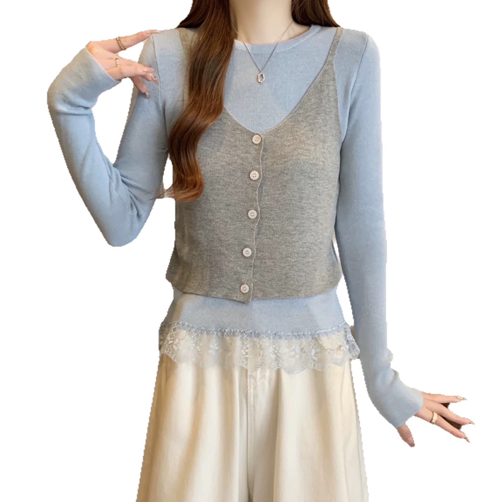 Главная страница > Модная корейская майка-топ, шикарный имитационный двухслойный трикотаж, женская кофта, весна 2025, новый стиль