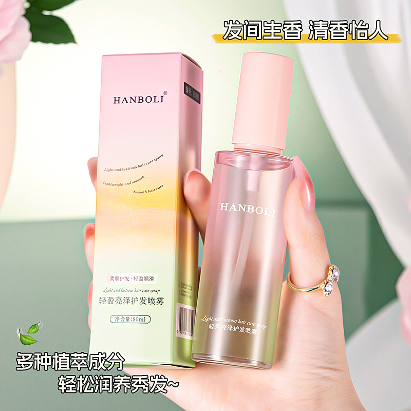 Спрей для ухода за волосами Hanboli, легкий и блестящий, предотвращает сухость и пушистость, обладает освежающим, нежирным, стойким ароматом, а также является незаменимым уходовым маслом для гладкости волос.