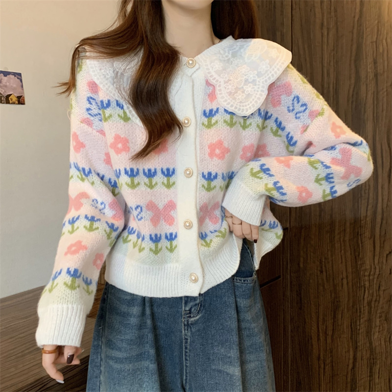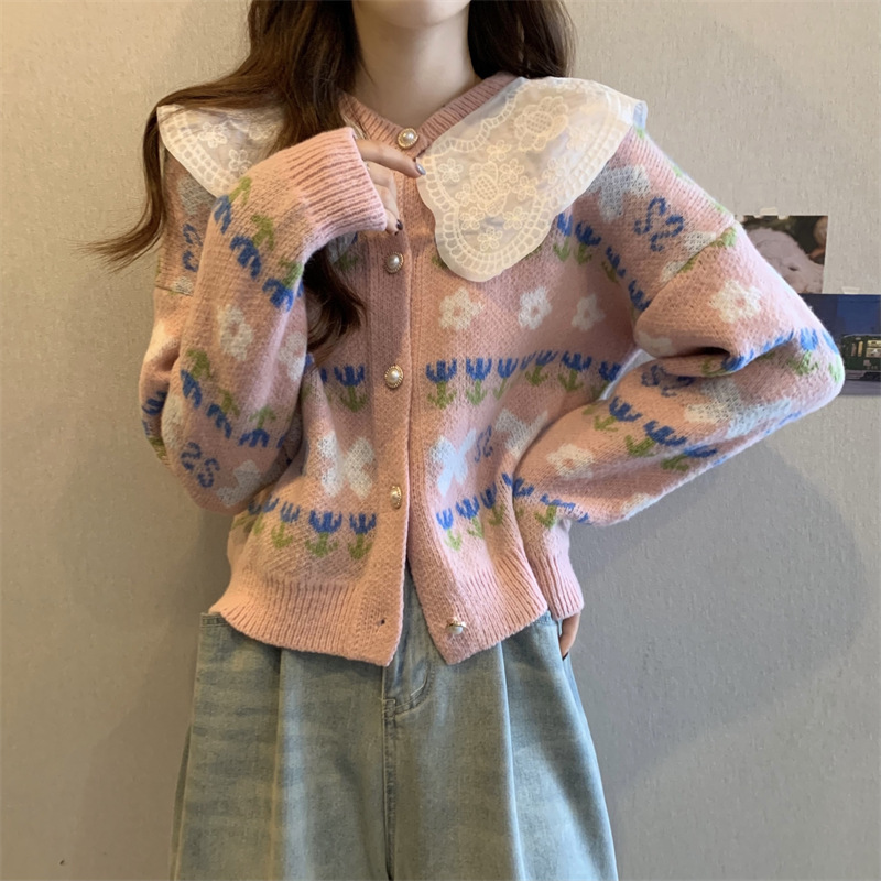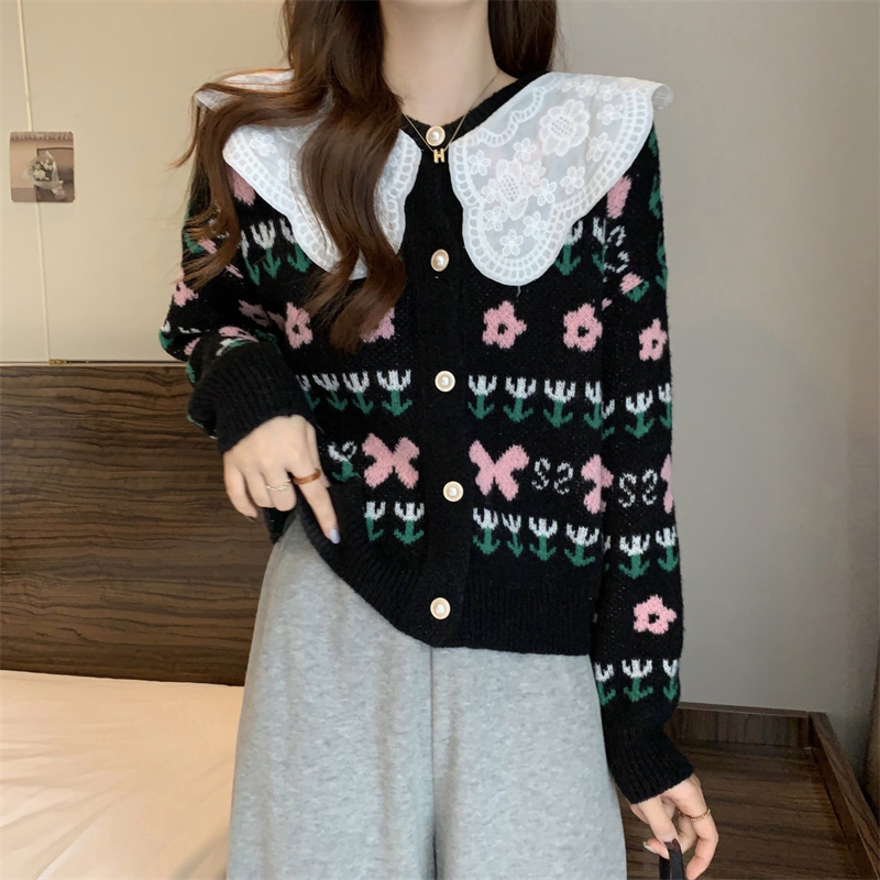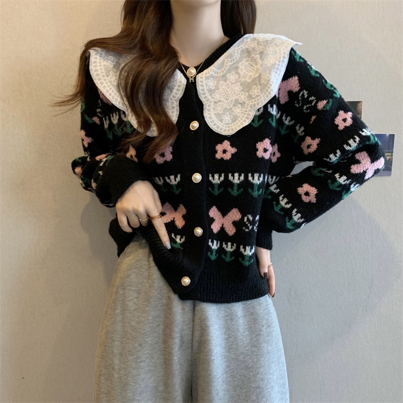 Главная страница > Осенний новый стильный кружевной вязаный кардиган с кукольным воротником, женский дизайн, уменьшающий возраст трикотаж с длинными рукавами