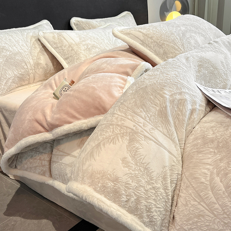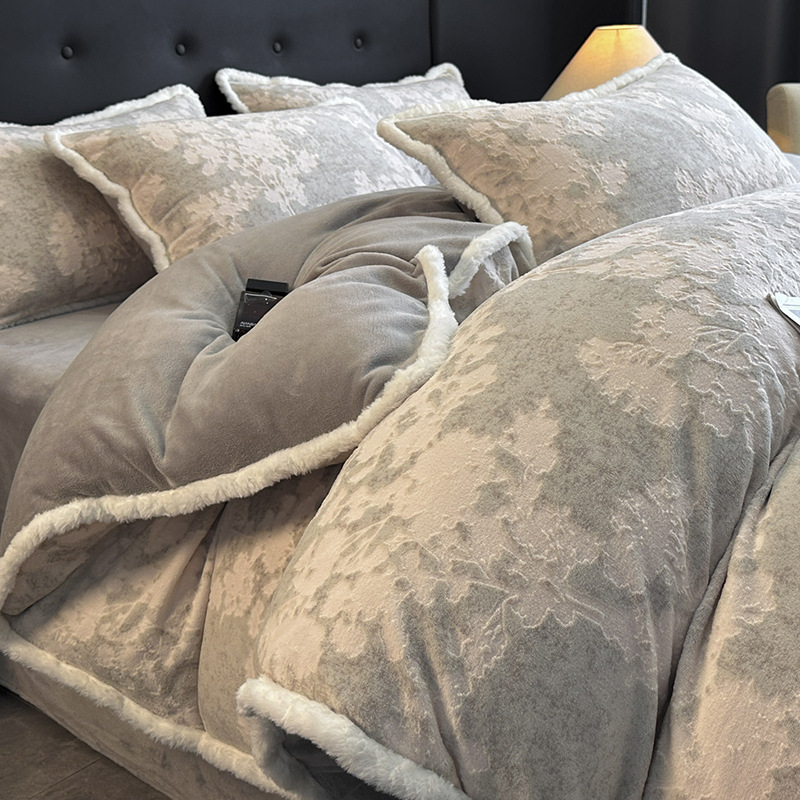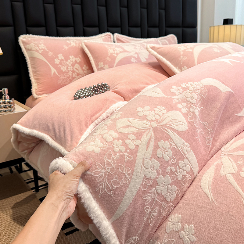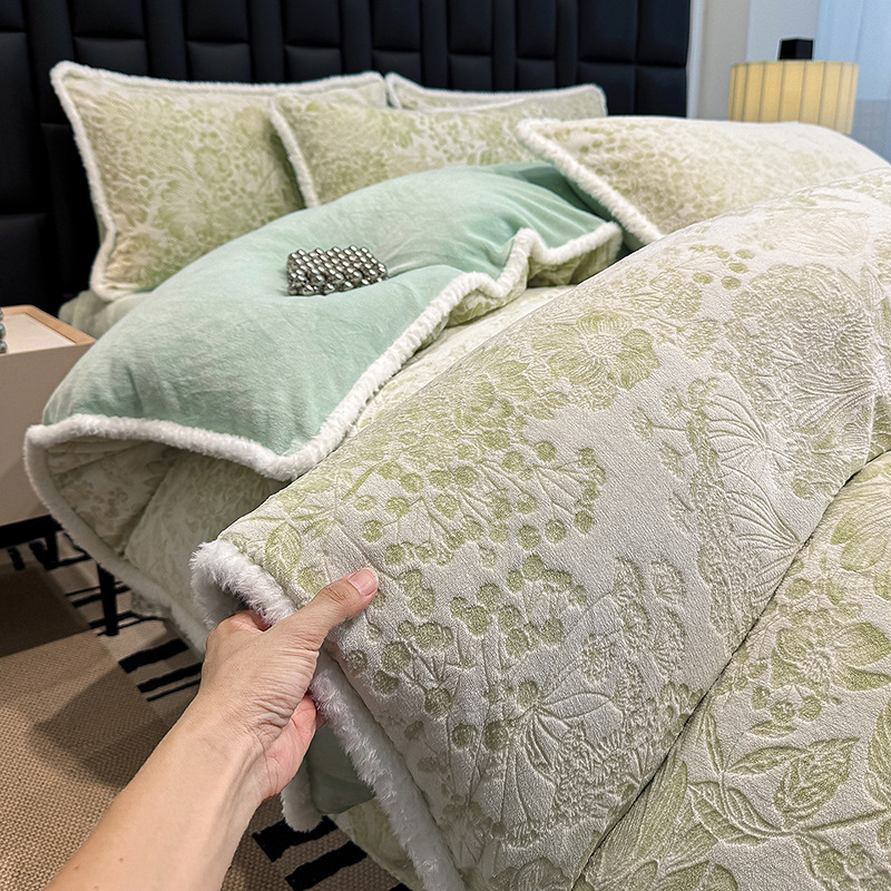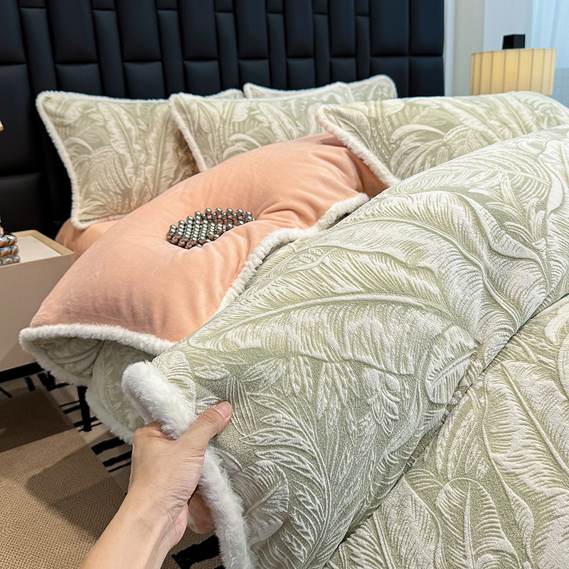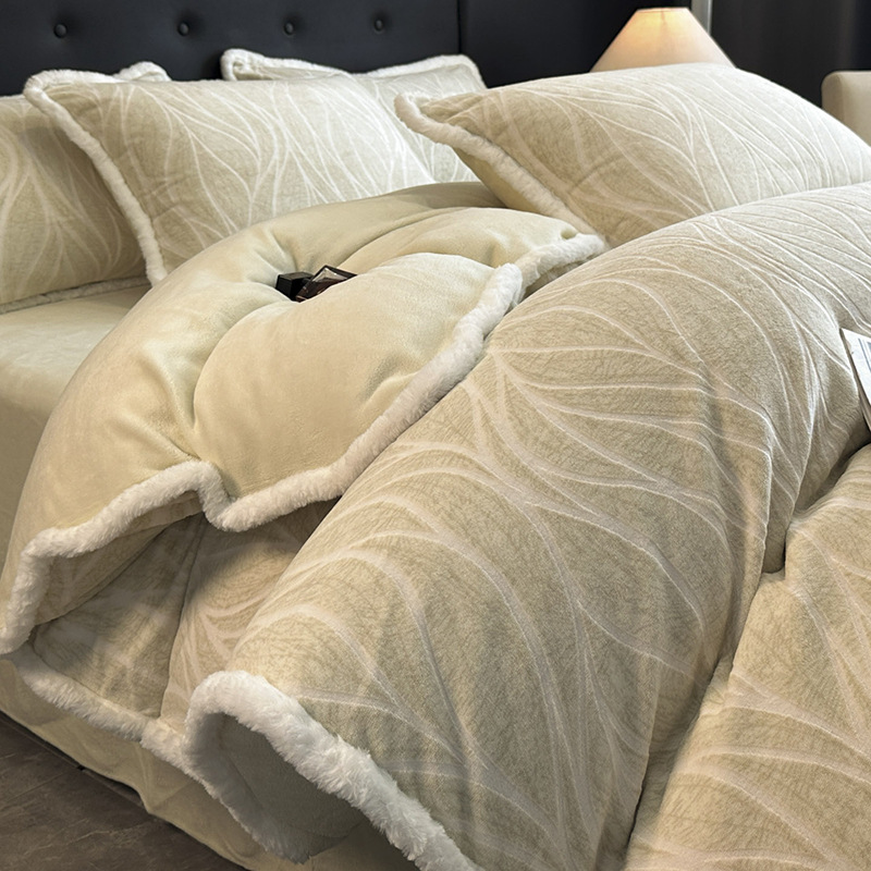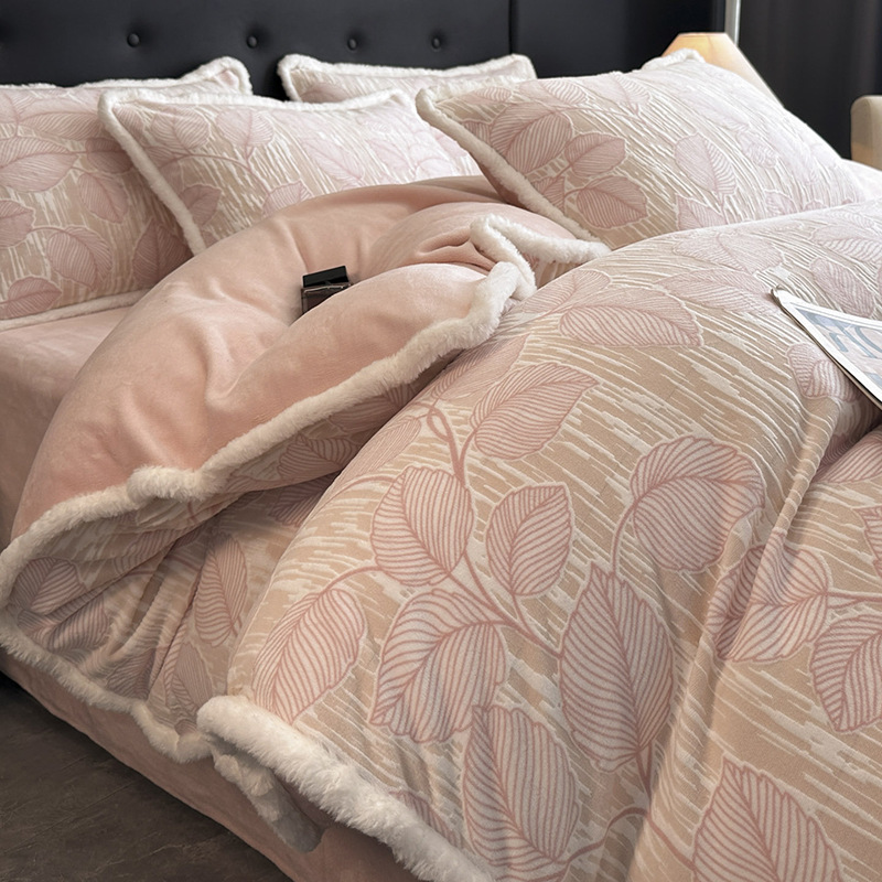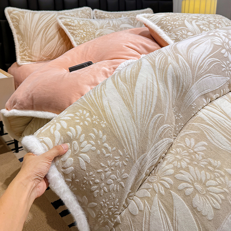 Набор постельного белья из четырех предметов: утолщенный, приятный для кожи, с объемной резьбой, из молочного вельвета, зимний, теплый, двусторонний флис, простыня, пододеяльник.