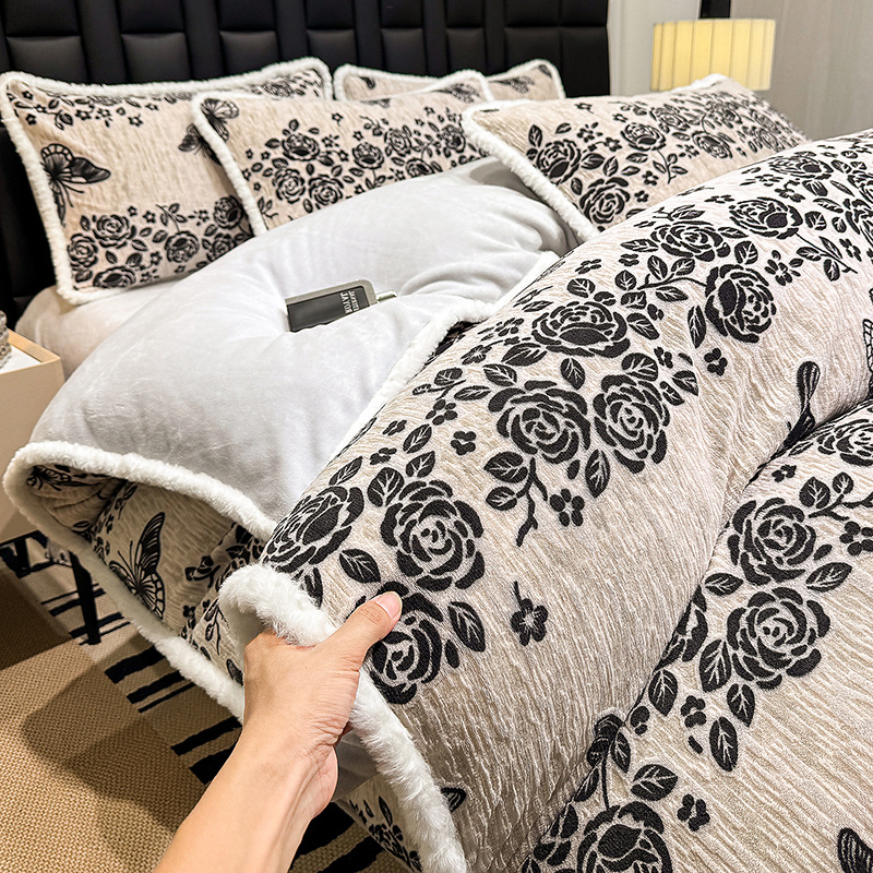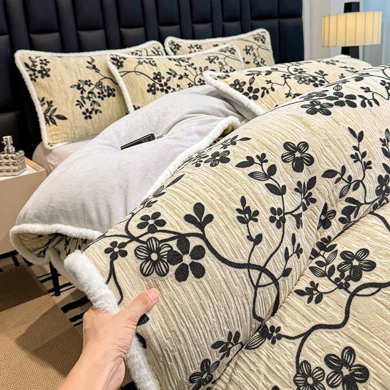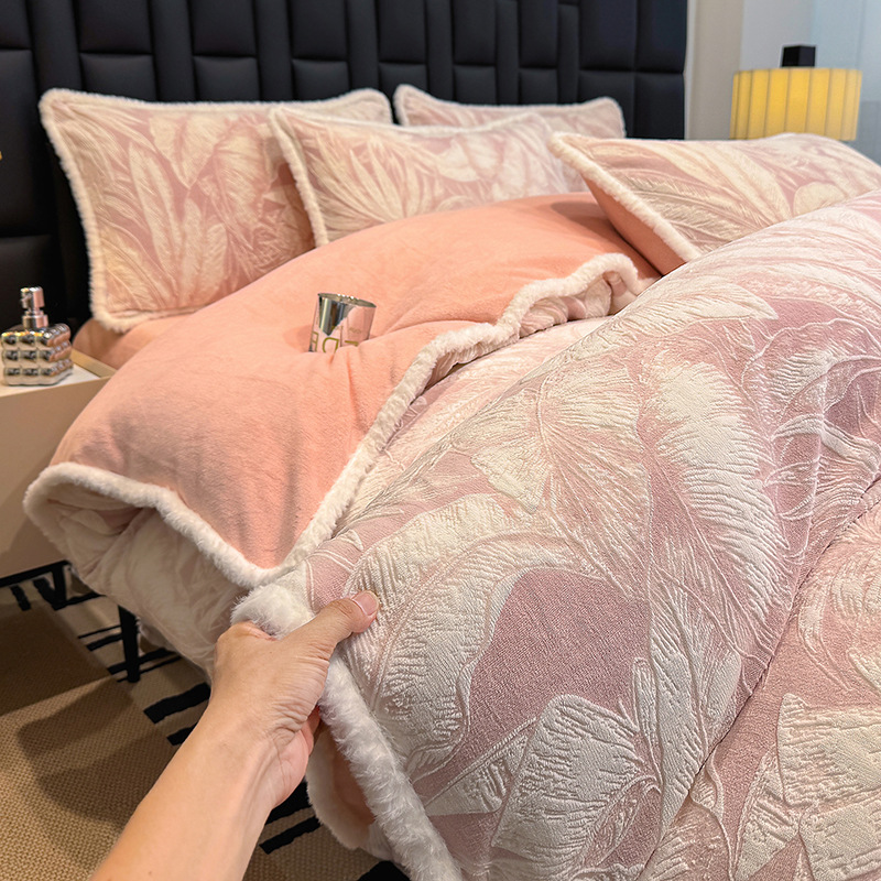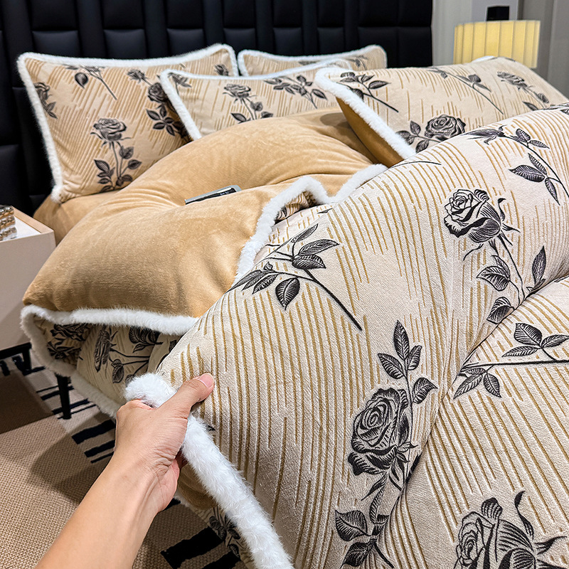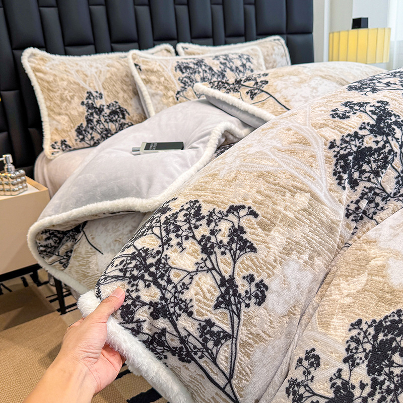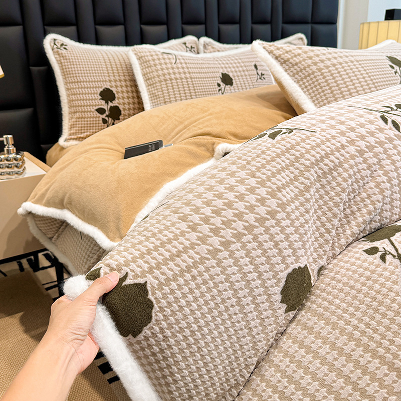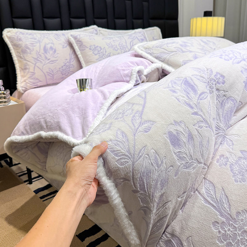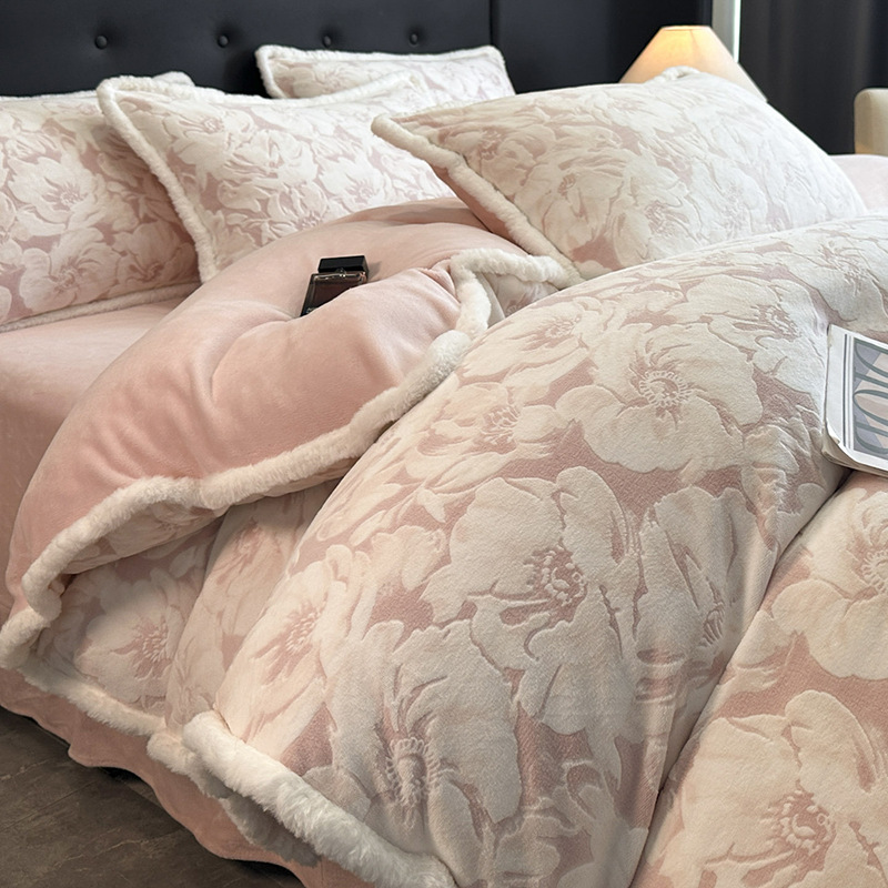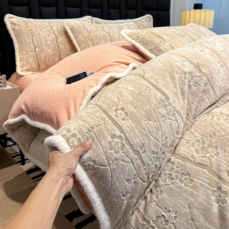 Набор постельного белья из четырех предметов: утолщенный, приятный для кожи, с объемной резьбой, из молочного вельвета, зимний, теплый, двусторонний флис, простыня, пододеяльник.