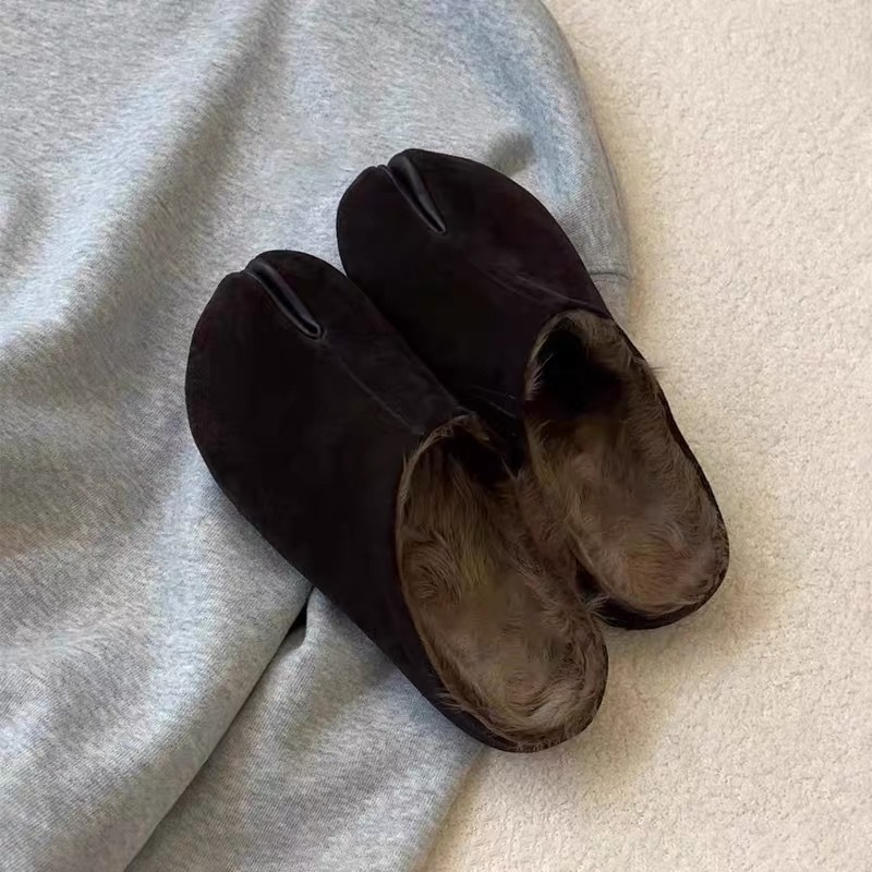 Корейская версия 2024, осенне-зимние новые плюшевые полутапочки для женщин, универсальные теплые туфли Birkenstock из натуральной кожи с разрезом на носке