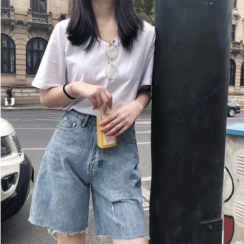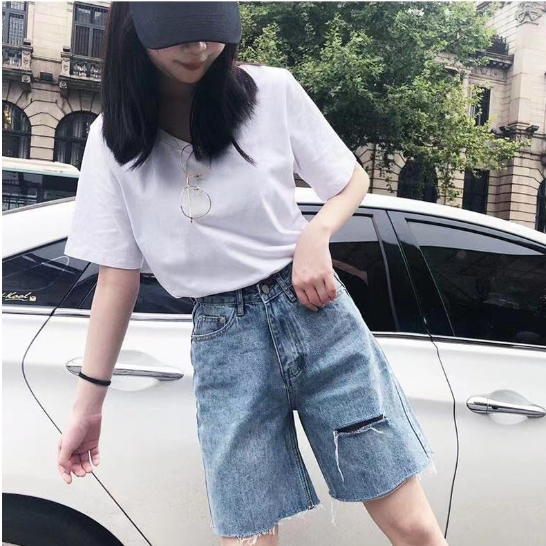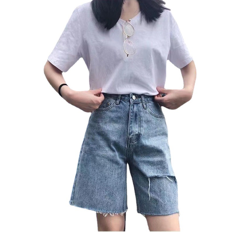 Джинсовые брюки с пятью точками, женские свободные прямые брюки средней длины, рваные брюки средней длины в гонконгском стиле, модная верхняя одежда, брюки с Торре, шорты средней длины