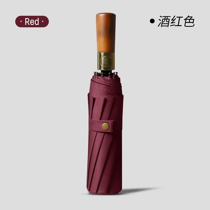 [Автоматический] 60-костный легкий роскошный зонт с деревянной ручкой (прочный штормостойкий кожаный чехол) - бордовый