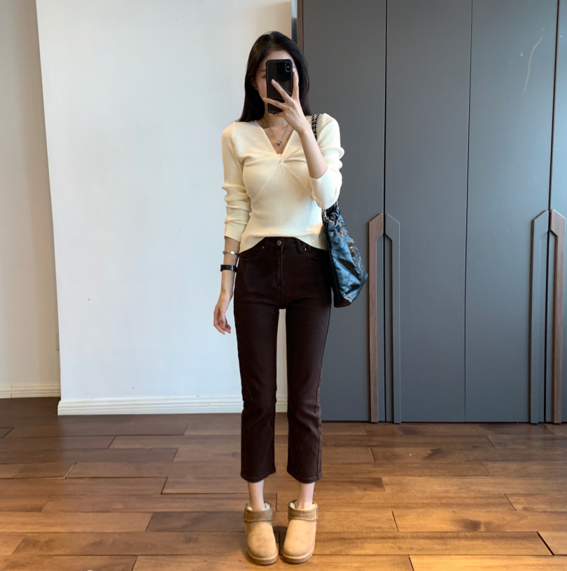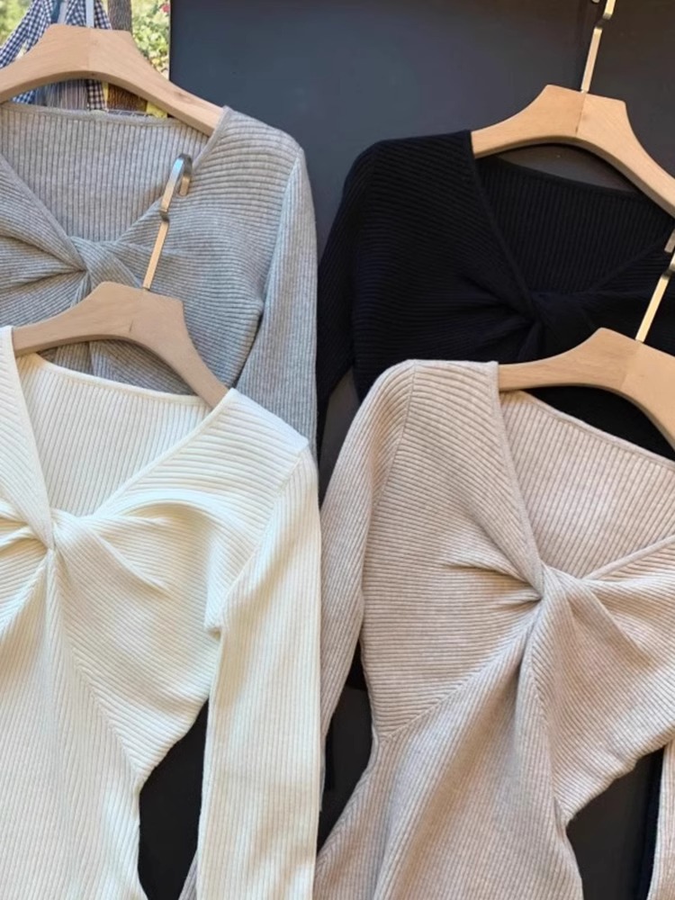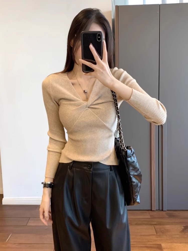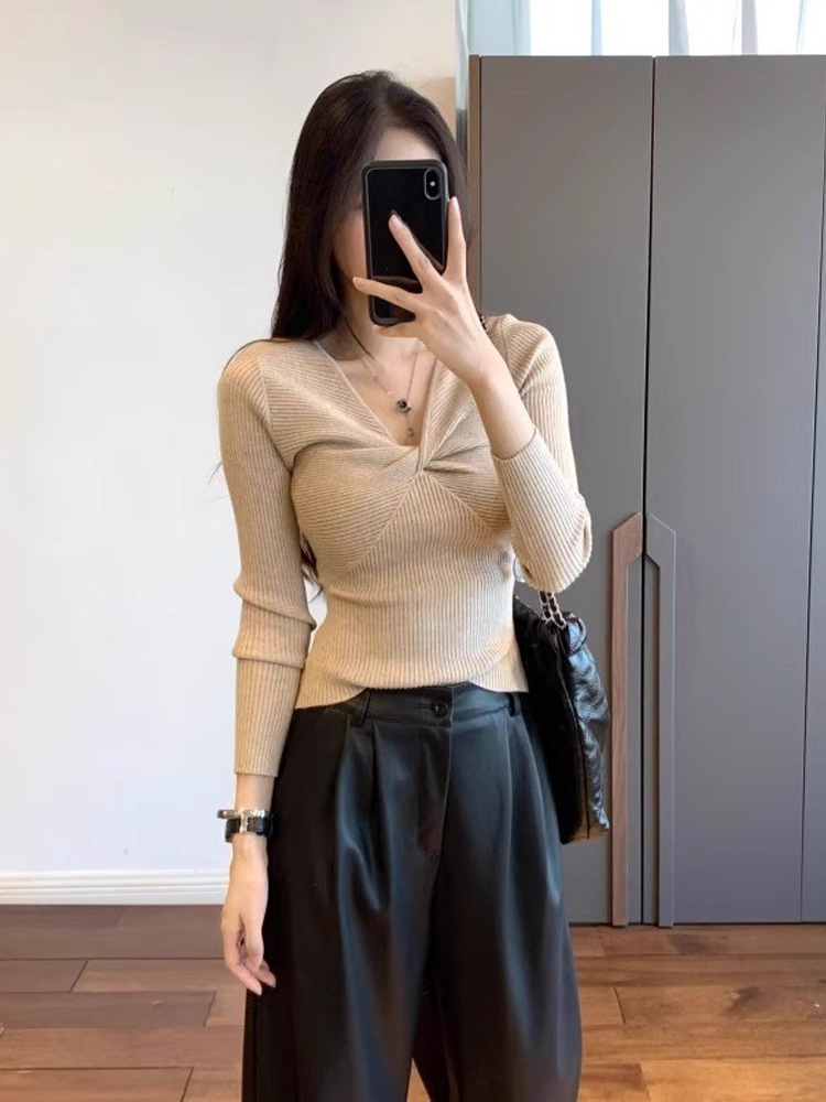Главная страница > Женский трикотажный топ с V-образным вырезом, облегающий крой, новая весенняя модель, стильный базовый слой для ношения под одеждой.