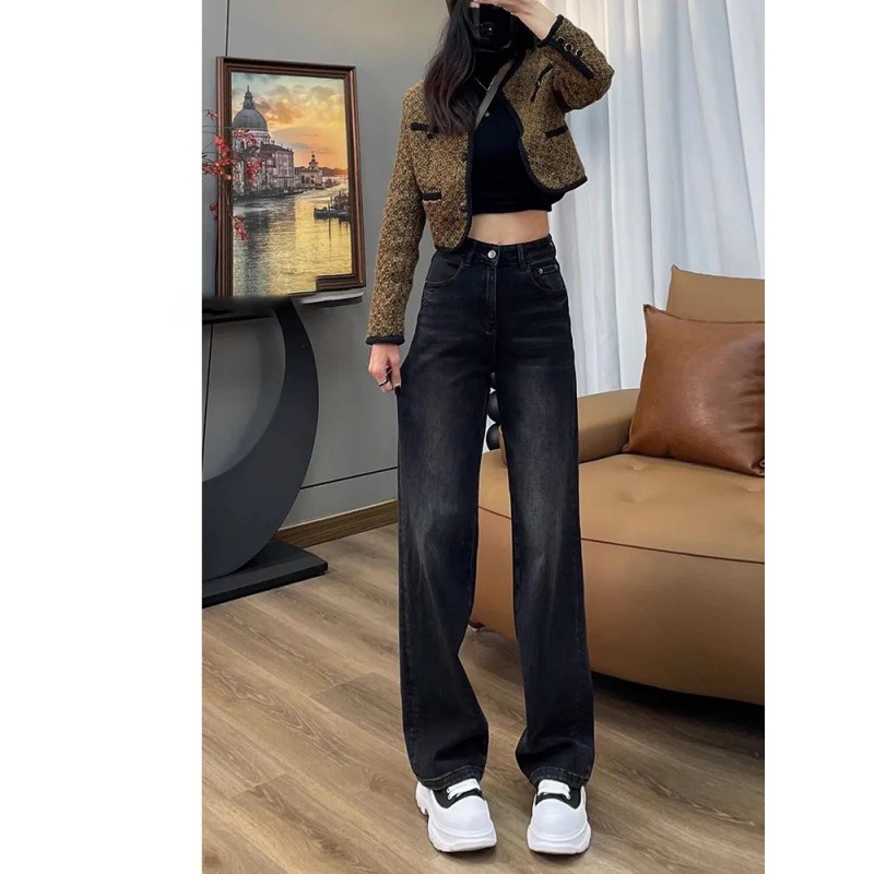 Главная страница > Черные джинсы с широкими штанинами на флисовой подкладке, толстые узкие женские зимние новые свободные прямые штаны для швабры с высокой талией