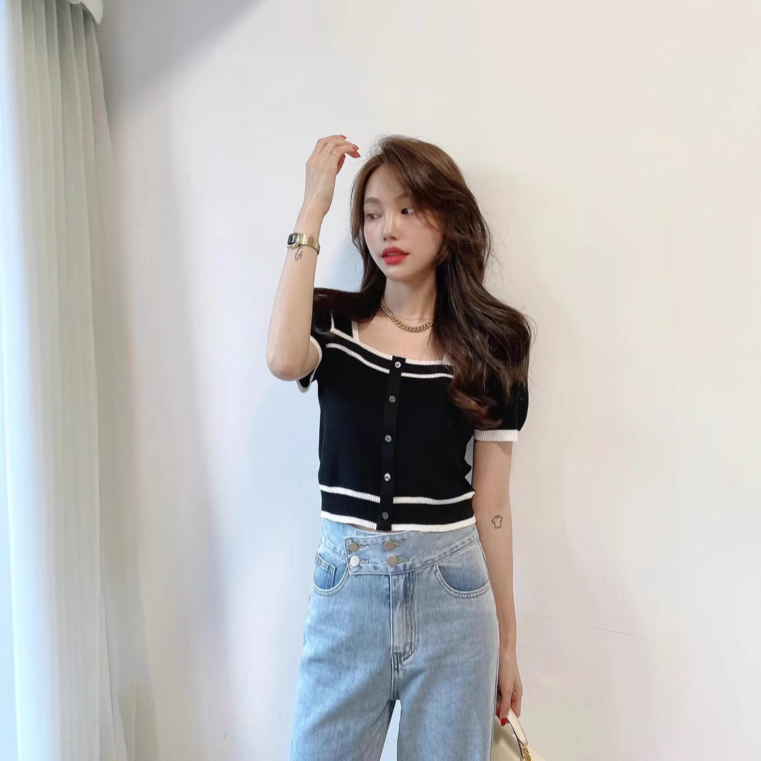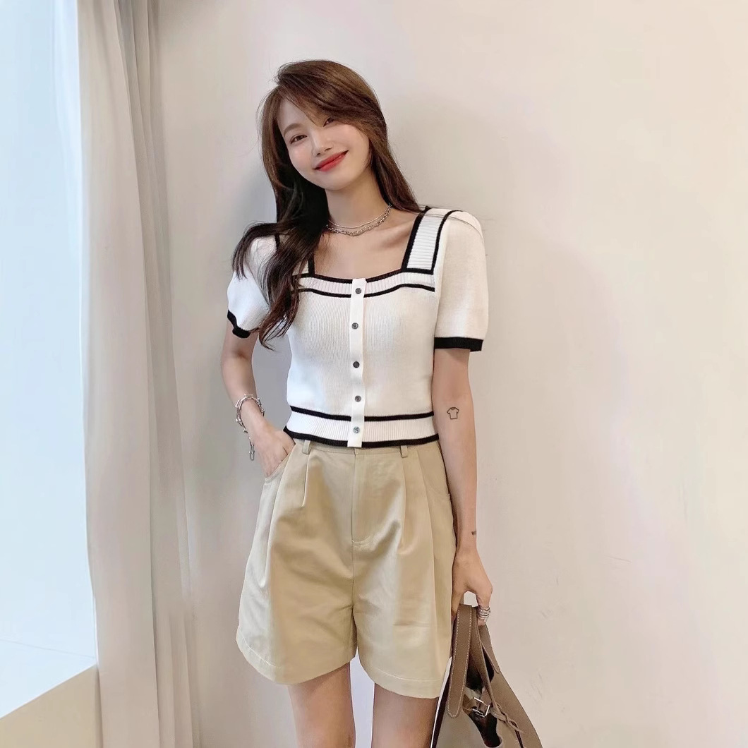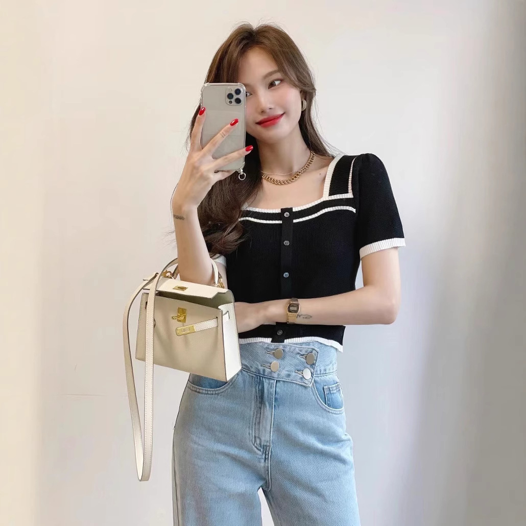 Главная страница > 2023 новый летний короткий трикотажный топ с квадратным вырезом и открытой спиной в корейском стиле контрастного цвета, короткий тонкий утягивающий трикотажный топ для женщин