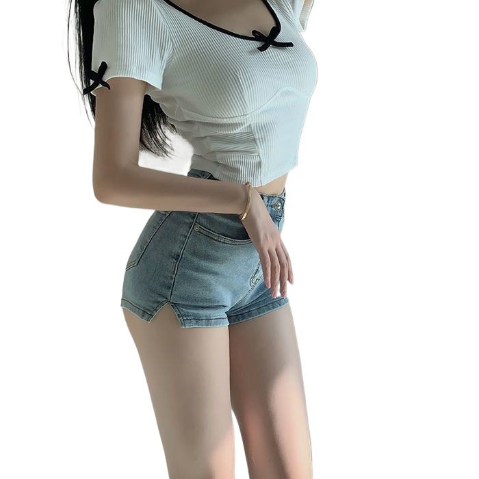 Главная страница > 浅蓝色开叉牛仔短裤女辣妹款高腰显瘦紧身弹力百搭a字热裤潮批发