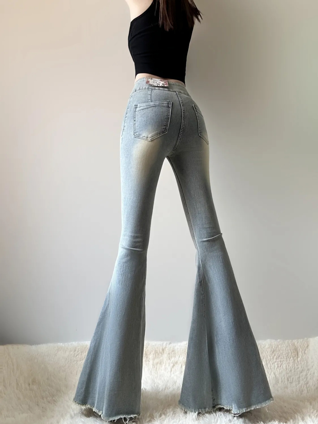 Рыбий хвост джинсы женский с высокой талией новый большой рог весной тонкий ретро эластичный стройный, широкие ноги и длинные брюки