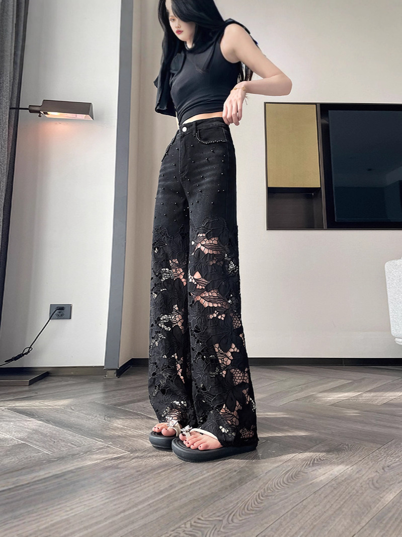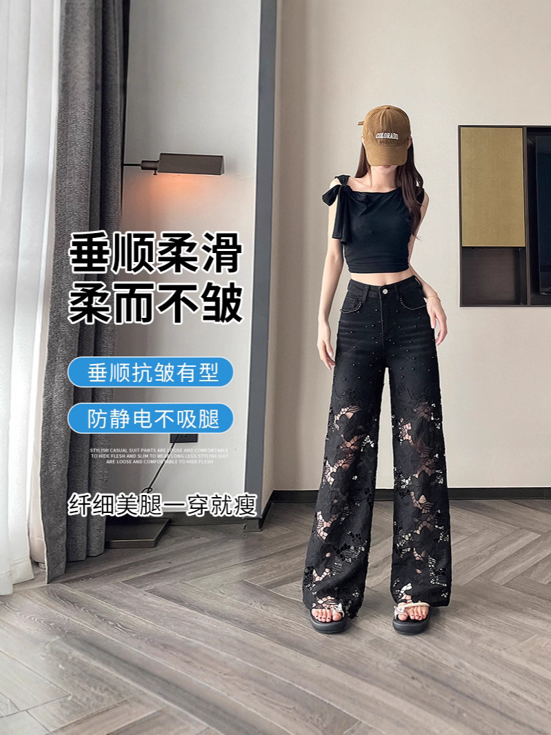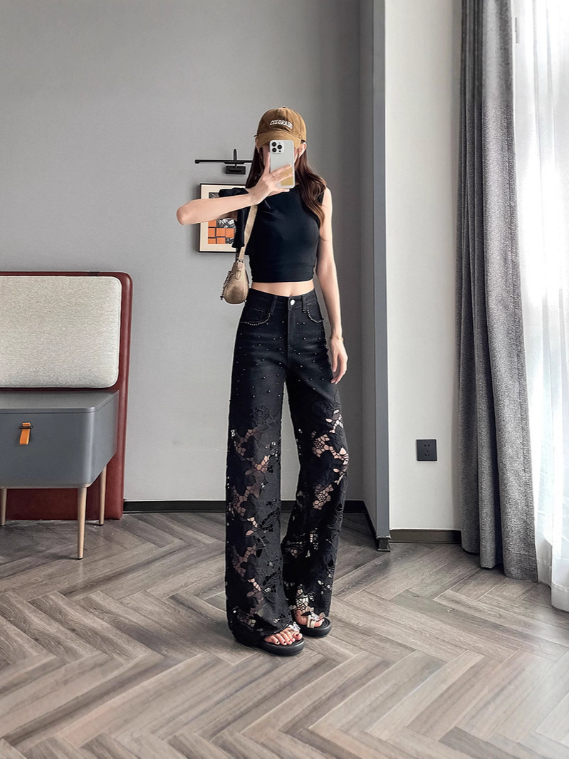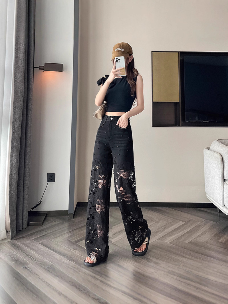 Главная страница > 2539 # Черные летние прямые брюки с вырезом, модные тонкие рваные женские джинсы с высокой талией