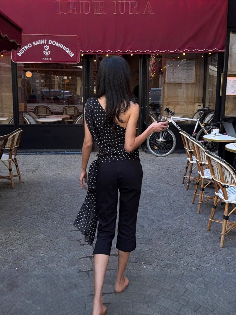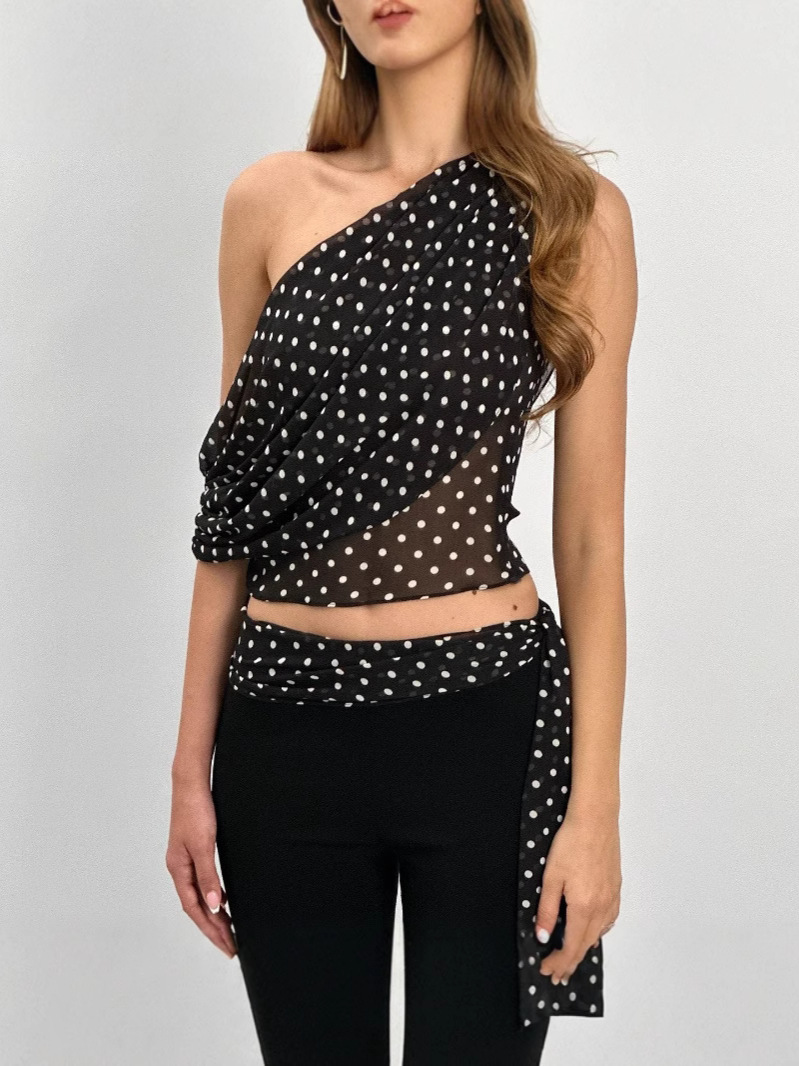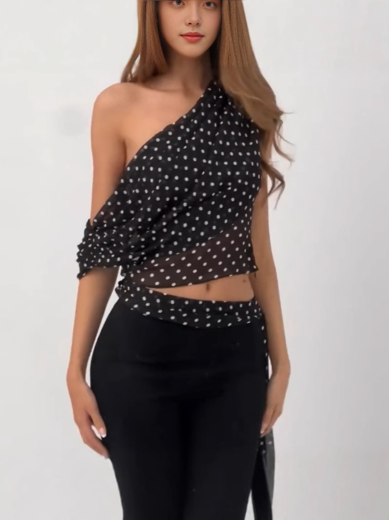 Главная страница > Женская одежда для трансграничной торговли: новинка осени 2025 – сексуальный асимметричный топ-майка из шифона в горошек, прозрачный, элегантный, асимметричный крой.