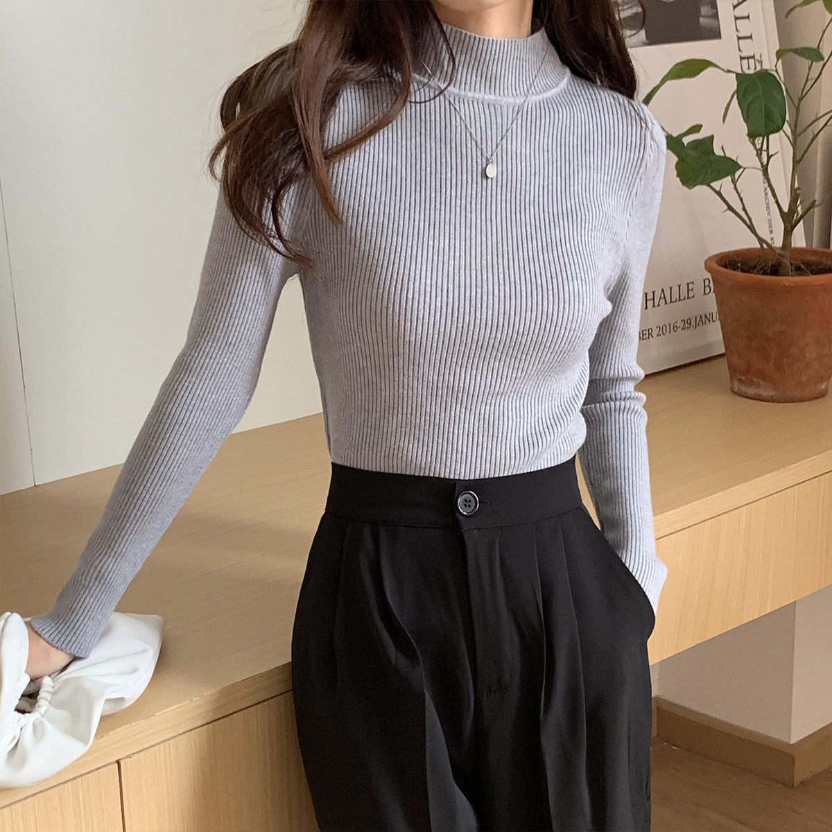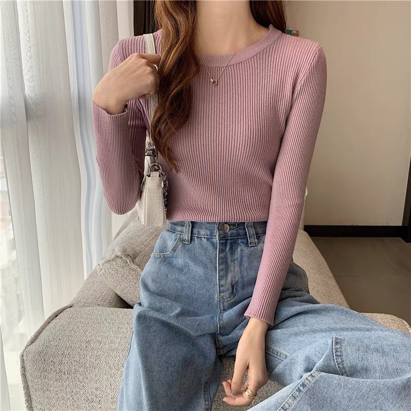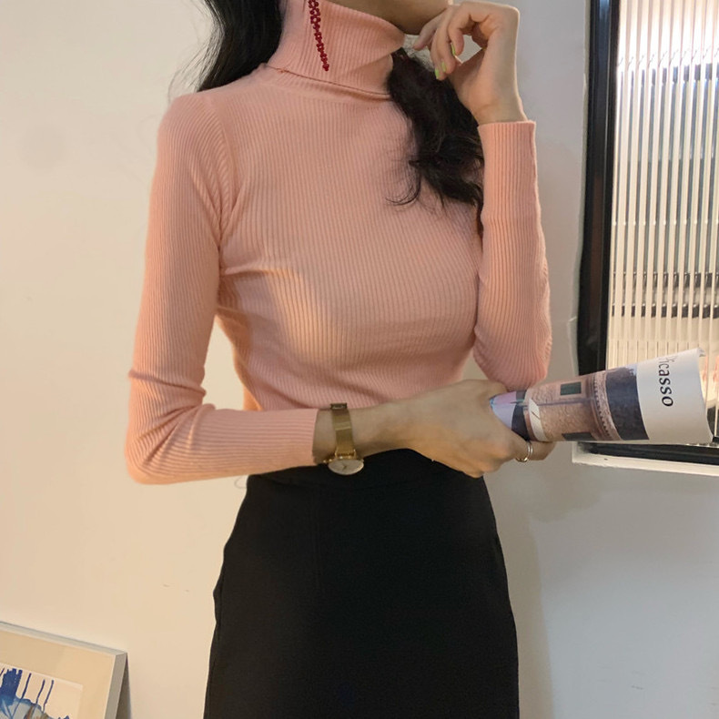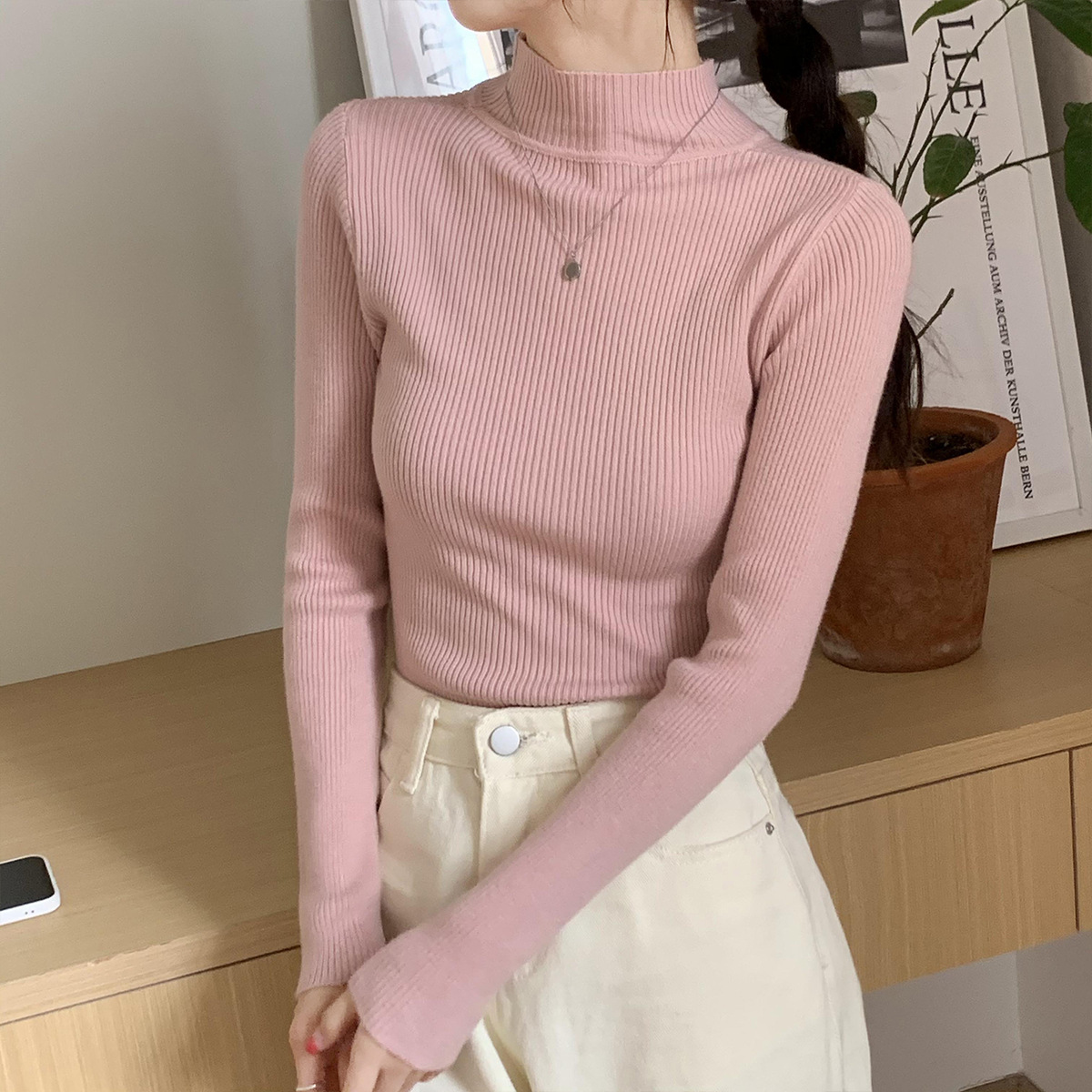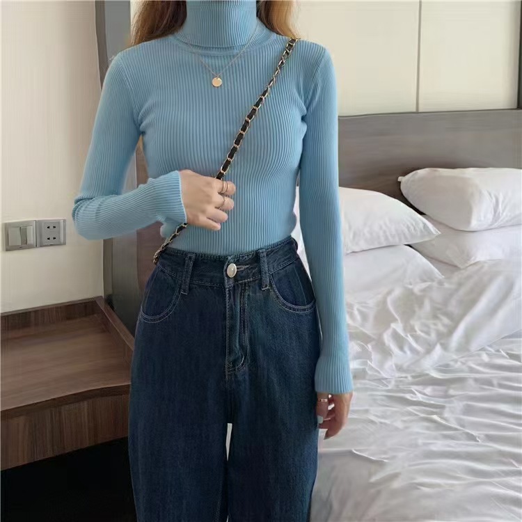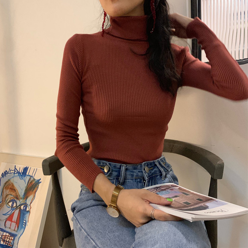 Главная страница > Оптовая продажа однотонных женских базовых свитеров с воротником-стойкой, универсальных для осени и зимы, облегающих трикотажных изделий с высоким воротом для студентов, свитеров с высоким воротом для женщин.