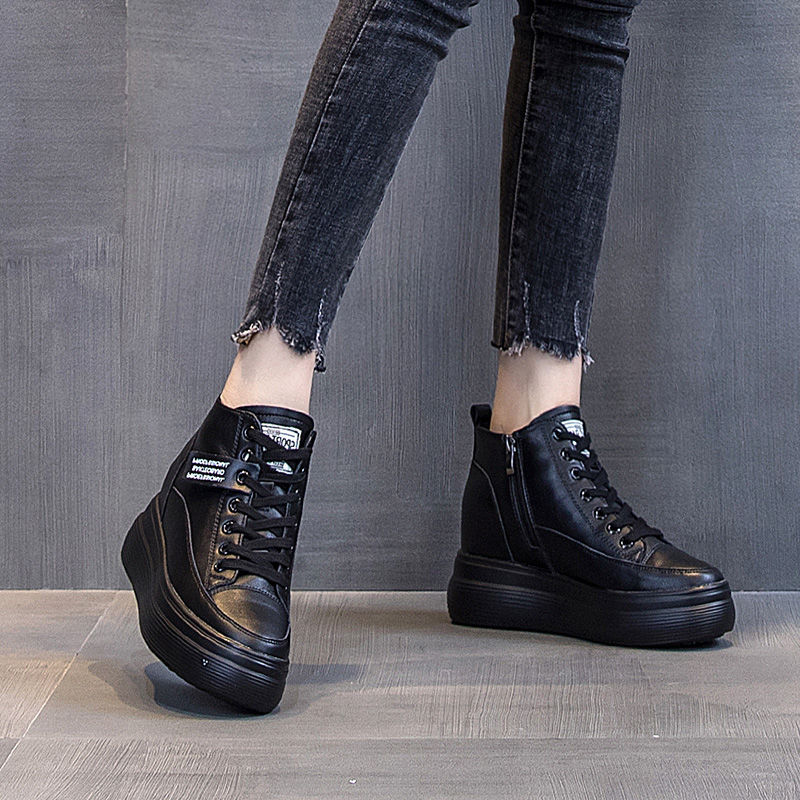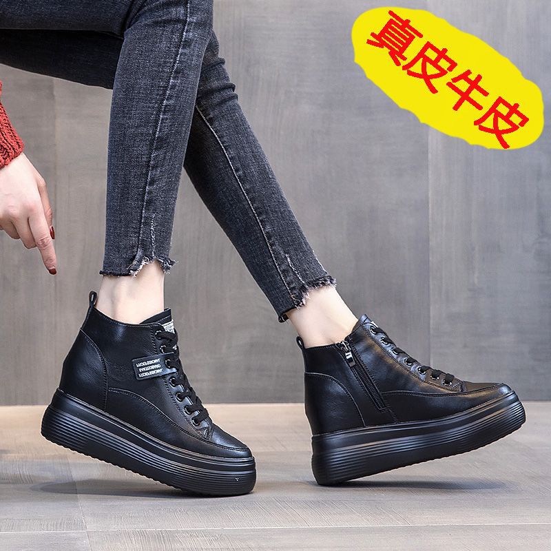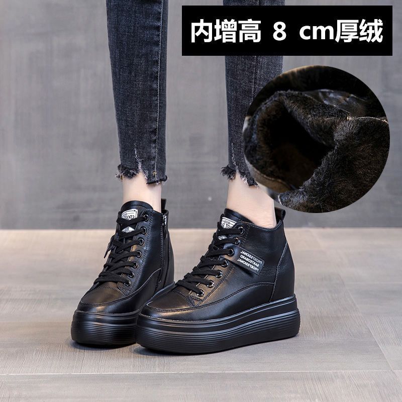 Черные кожаные высокие ботинки женские внутренние увеличенные 8 толстых днища плюс бархат 2025 новые осенние и зимние повседневные кроссовки