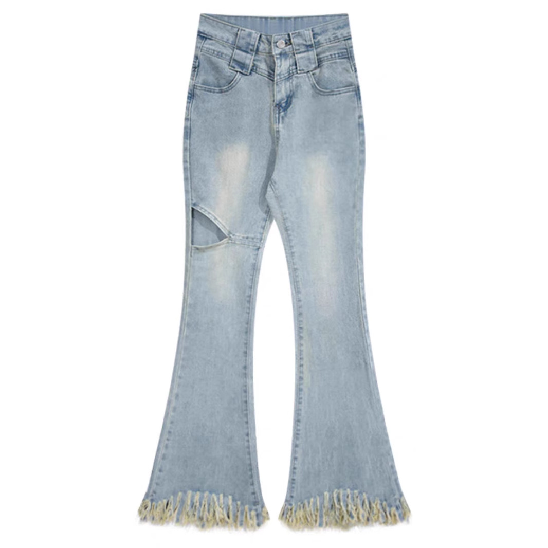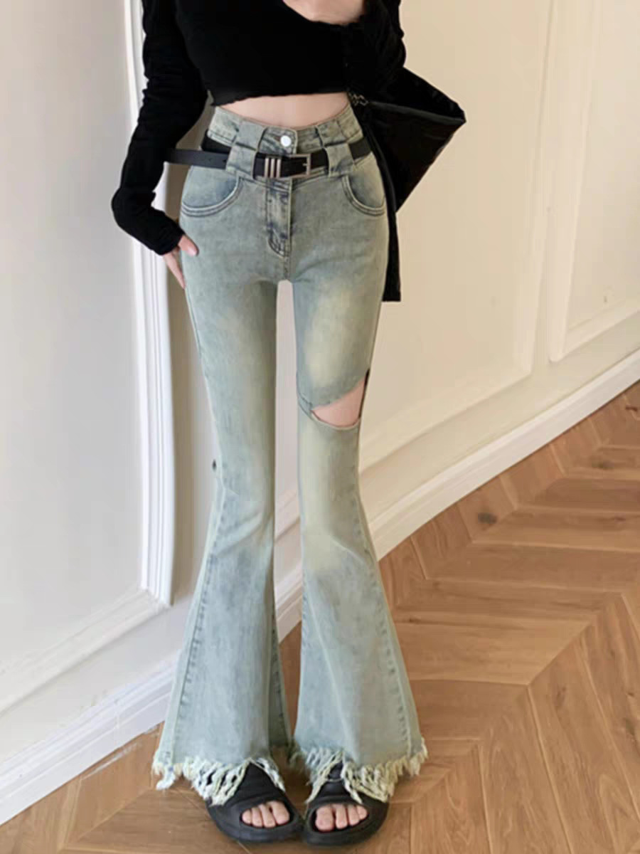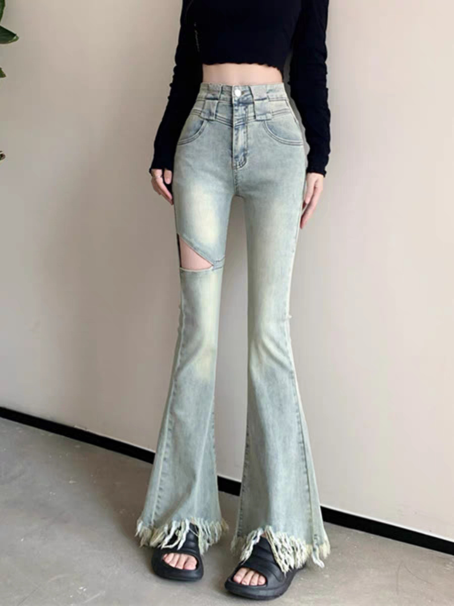 Настоящая фотография рваных брюк с микроклешами в форме подковы с высокой талией, утягивающих джинсов с необработанными краями для женщин, летние брюки с микроклешами для горячих девушек