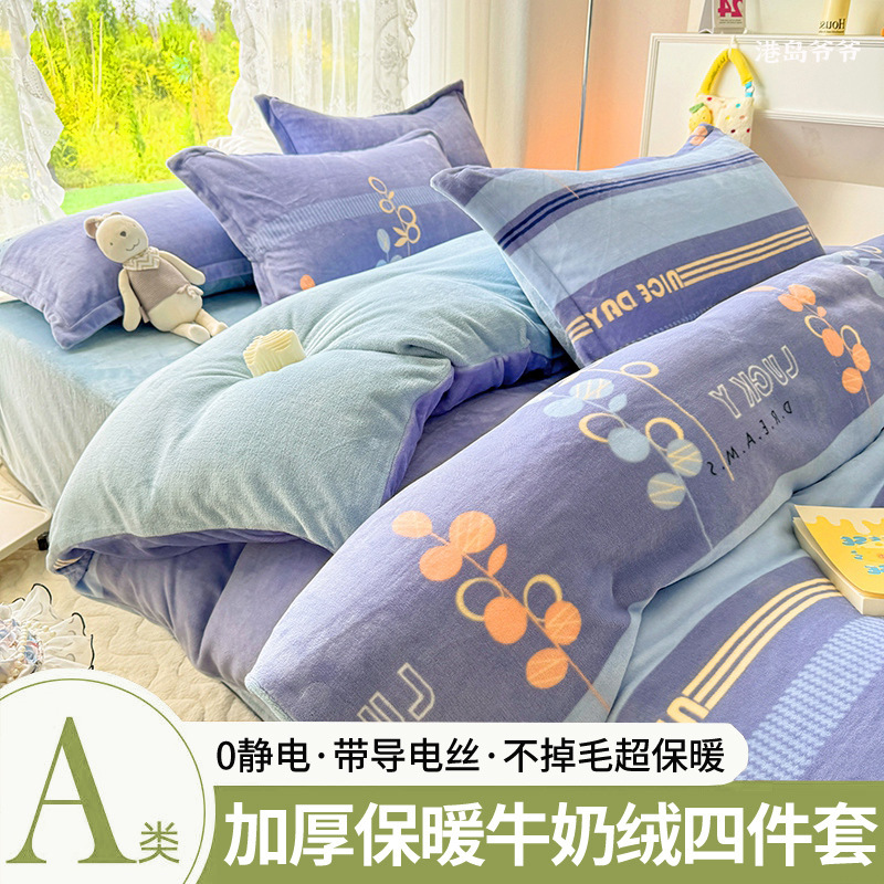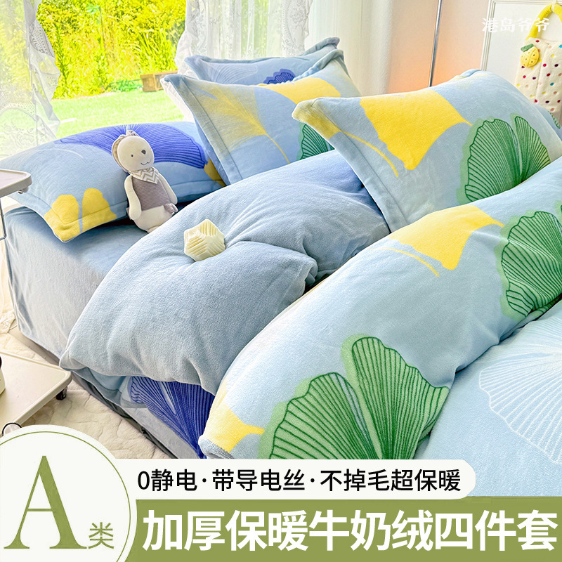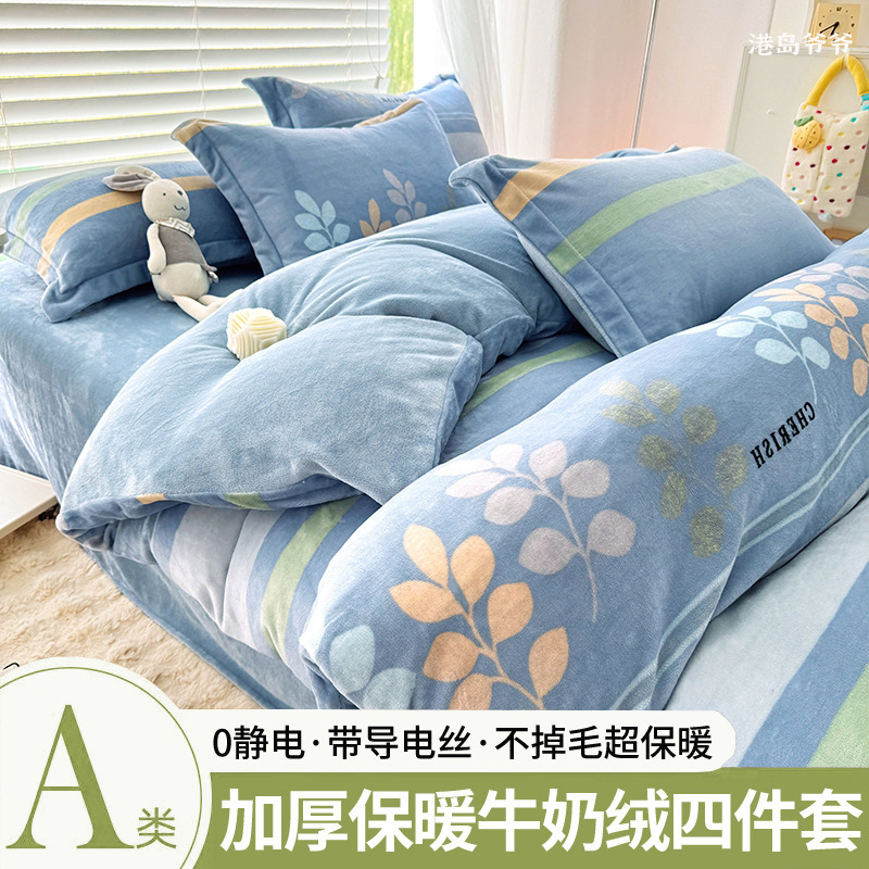 Комплект из четырех предметов из зимнего молочного вельвета класса А, утолщенное двустороннее коралловое вельветовое простыня на резинке, пододеяльник, пододеяльник на флисовой подкладке, комплект из трех предметов для кровати.