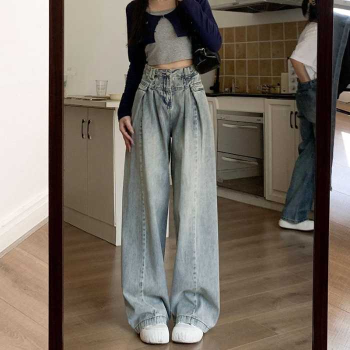 Женские широкие джинсы с высокой талией в стиле ретро, осенний новый стиль с плиссировкой для скрытия промежности, облегающие и универсальные свободные прямые брюки.