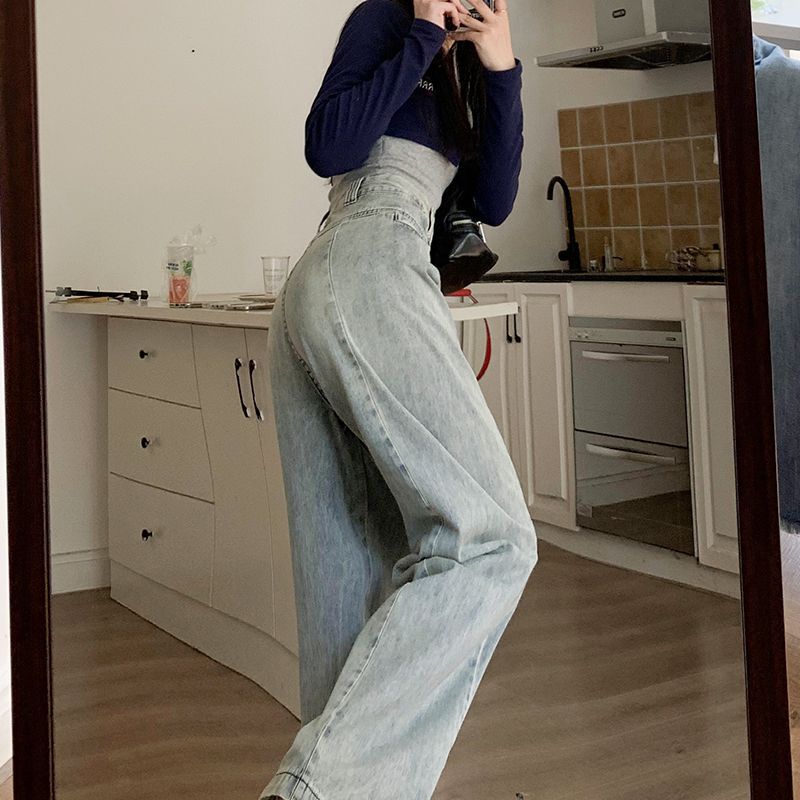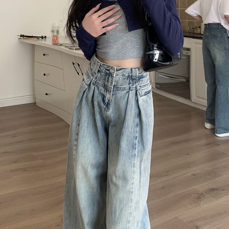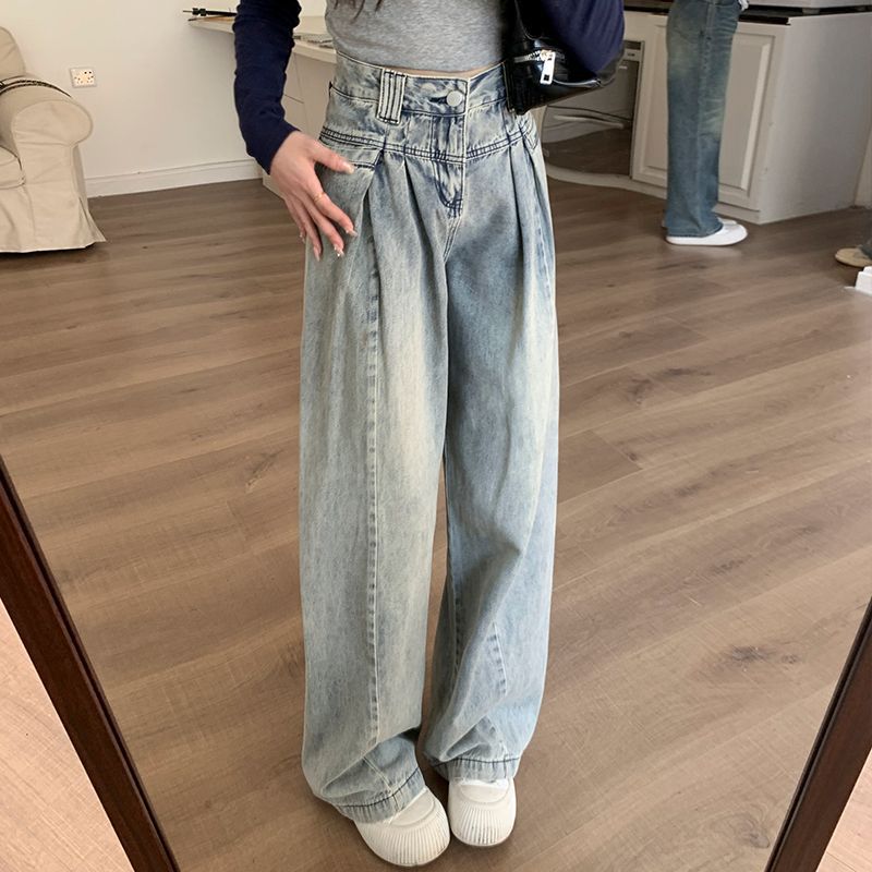Главная страница > Женские широкие джинсы с высокой талией в стиле ретро, осенний новый стиль с плиссировкой для скрытия промежности, облегающие и универсальные свободные прямые брюки.