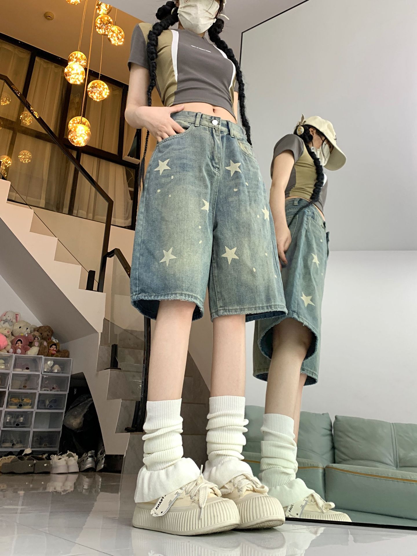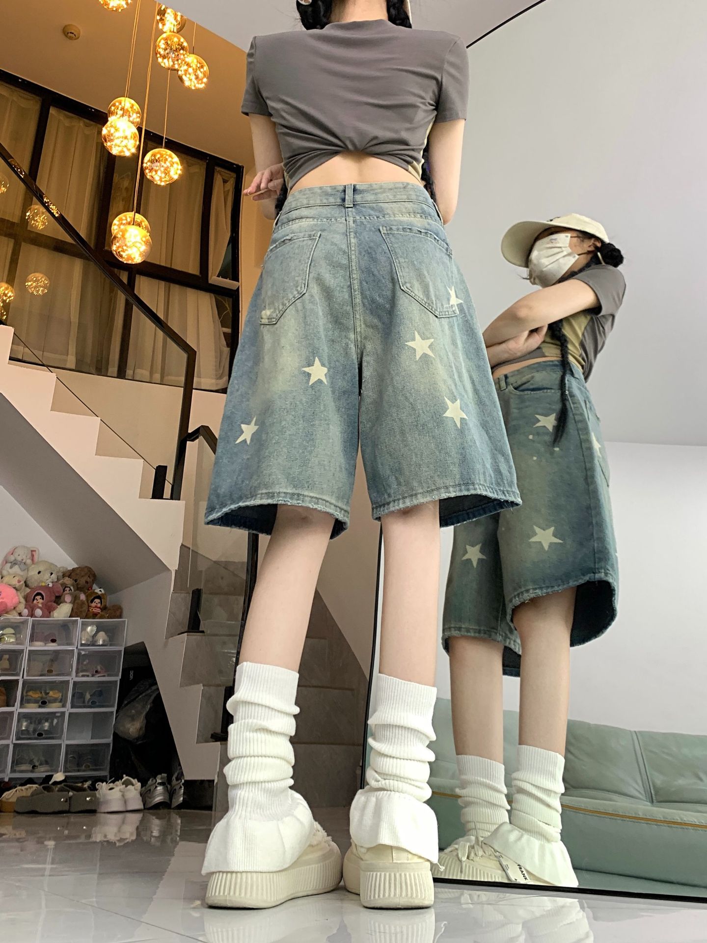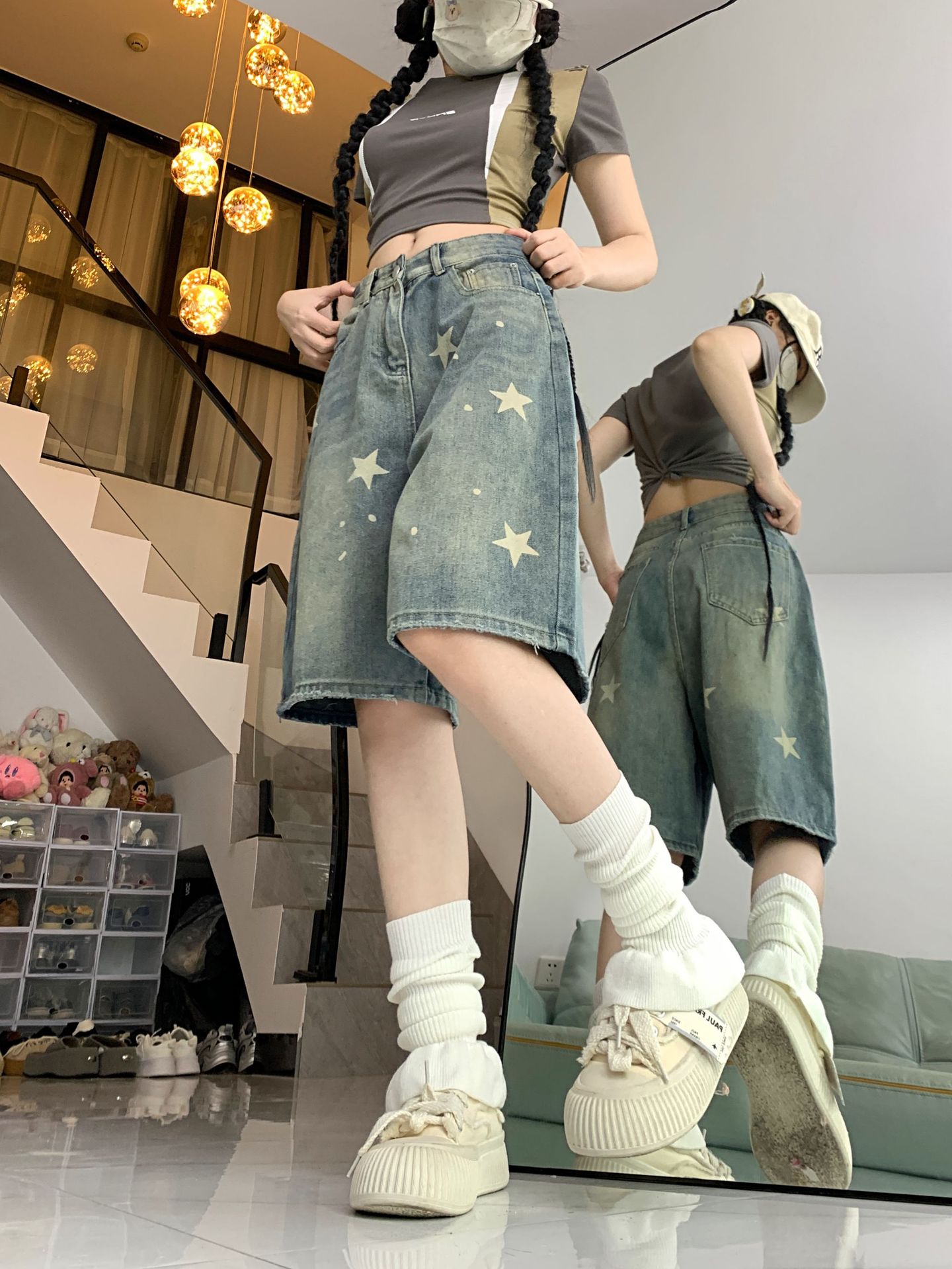 На самом деле стрелять! Ретро стирает старые звезды джинсовые шорты женские уличные прямые свободные тонкие широкие брюки