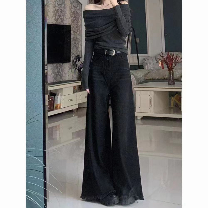 Главная страница > Большие черные широкие джинсы женские осенние новые высокие талии, свободная крышатая мясо, тонкая шерстяная труба
