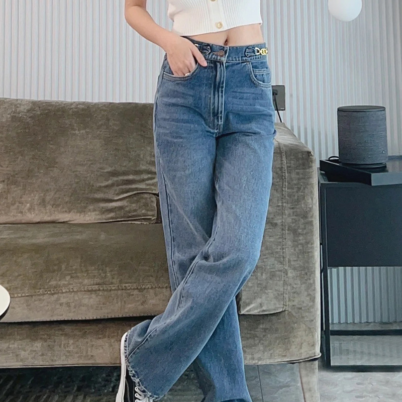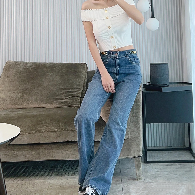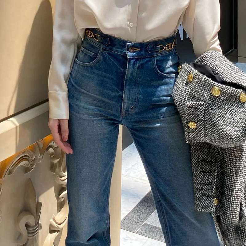 Главная страница > Джинсы женские из плотного денима с эффектом потертости, винтажные, с металлическими элементами, высокая талия, прямой крой, стройнящие.
