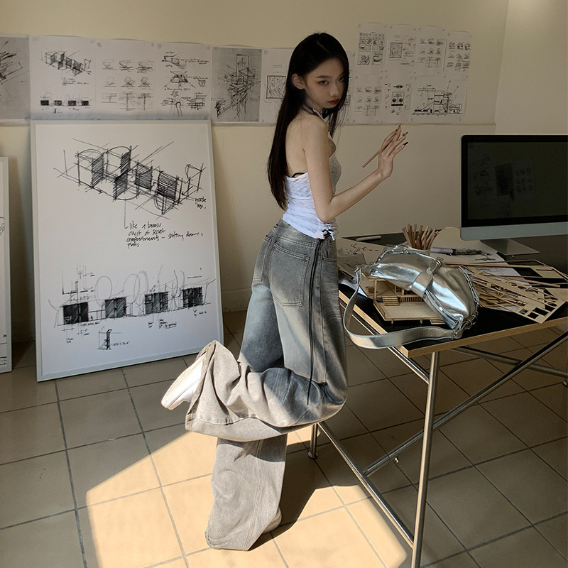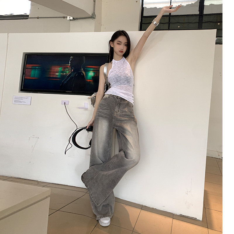 Главная страница > Мокко серый высокий уличный джинсовый широкий брюки для женщин весной и летом новая высокая талия тонкая и свободная вертикальная прямая брюки