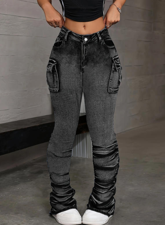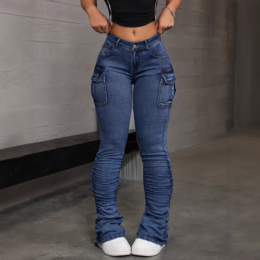 Европейские и американские трансграничные женские джинсовые брюки с боковыми складками дизайн средней и высокой талии эластичные ретро темно-синие комбинезоны