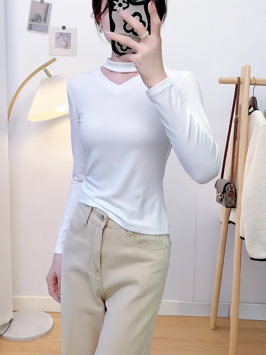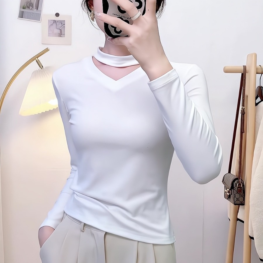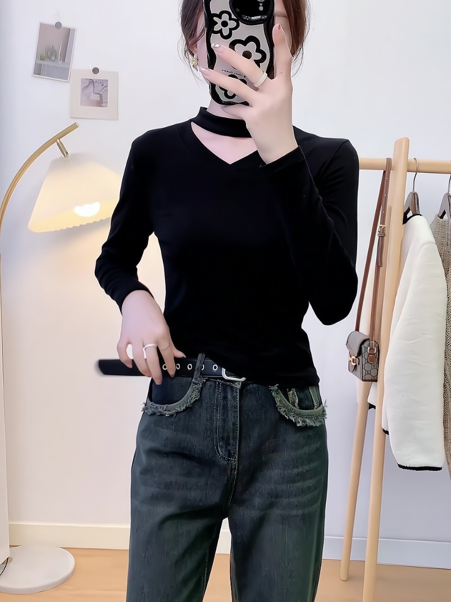 Главная страница > Осенне-зимняя мягкая восковая эластичная футболка с длинными рукавами, Женская приталенная маленькая Базовая рубашка с V-образным вырезом и открытыми плечами