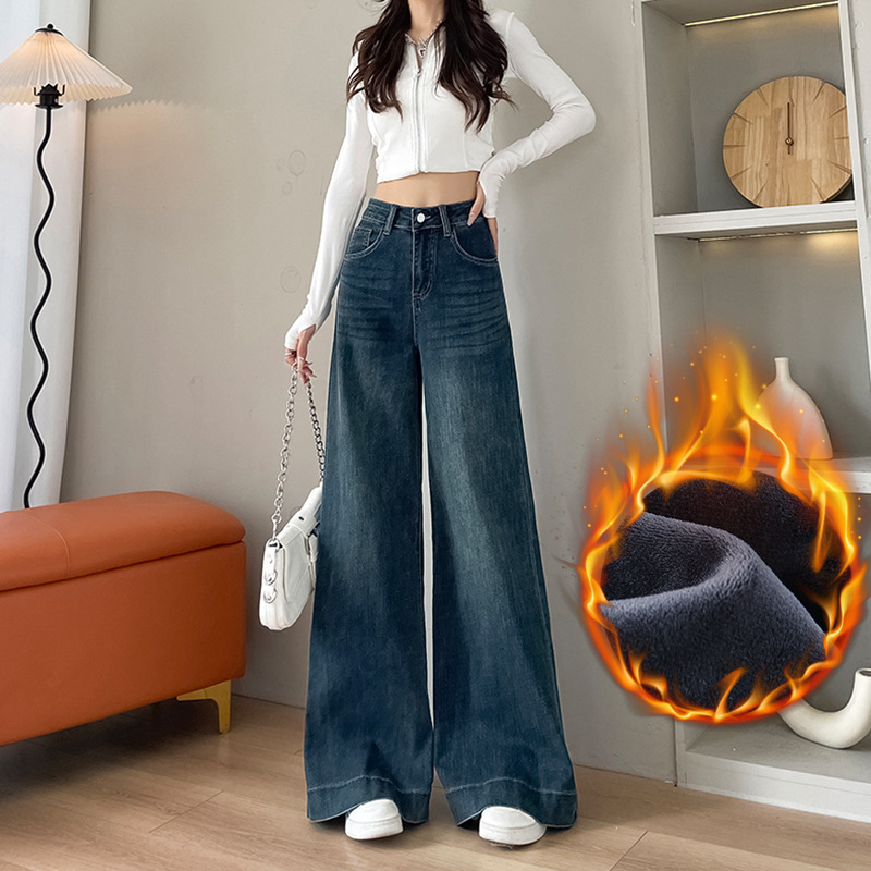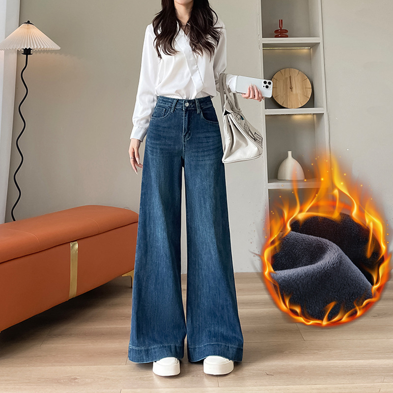 Главная страница > Темно-синие широкие джинсы для женщин с флисовой подкладкой, с высокой талией, свободного кроя, эластичные, стройнящие, в пол, для весны и осени.