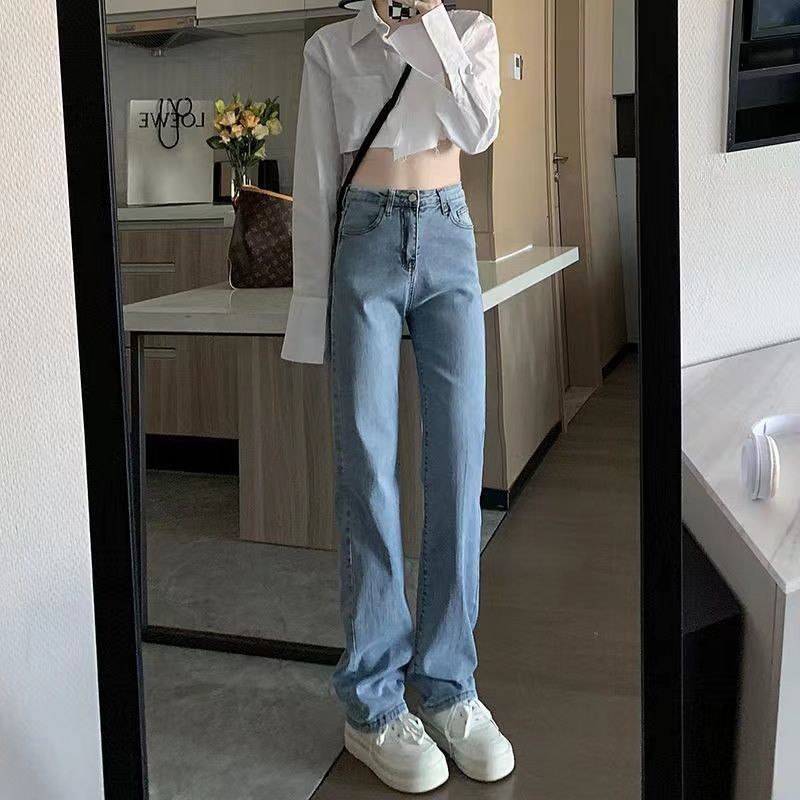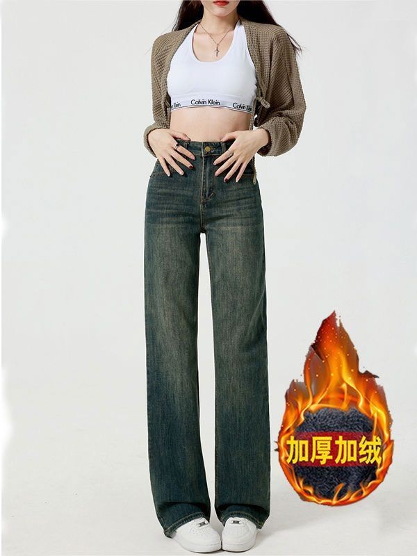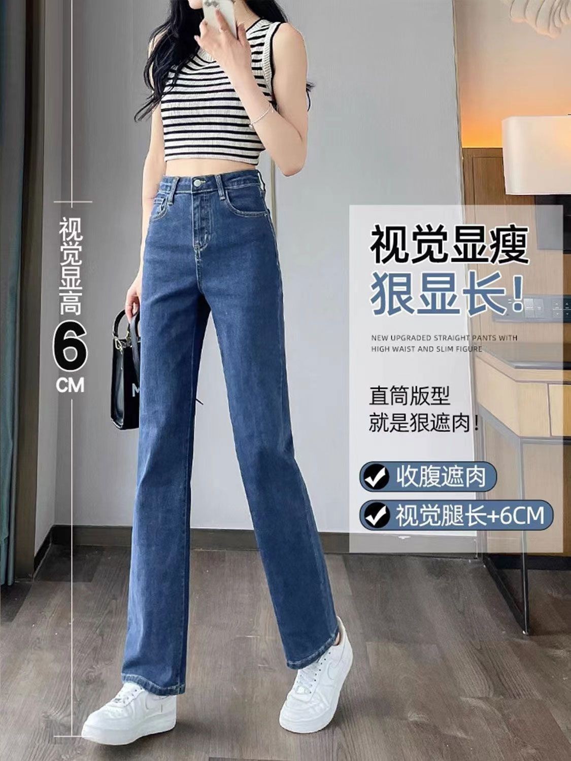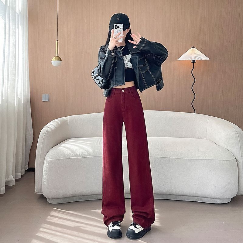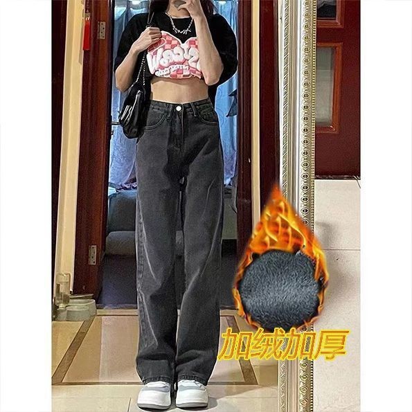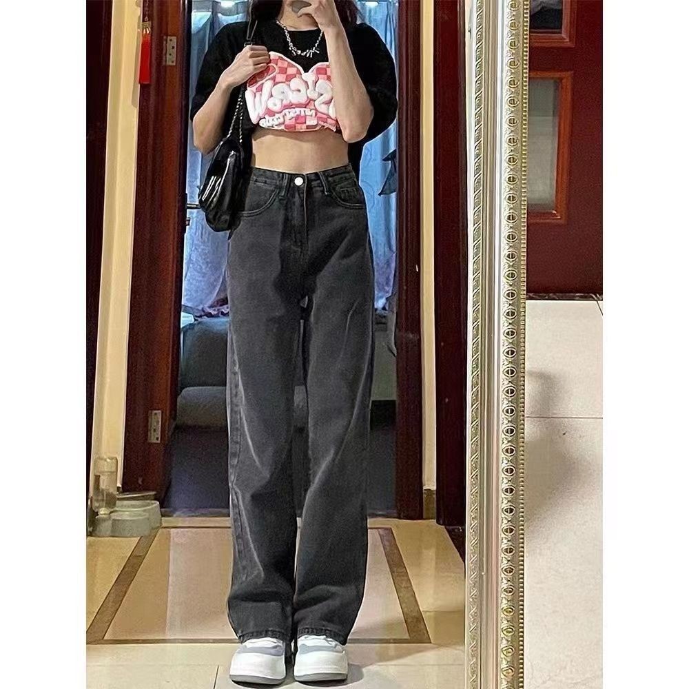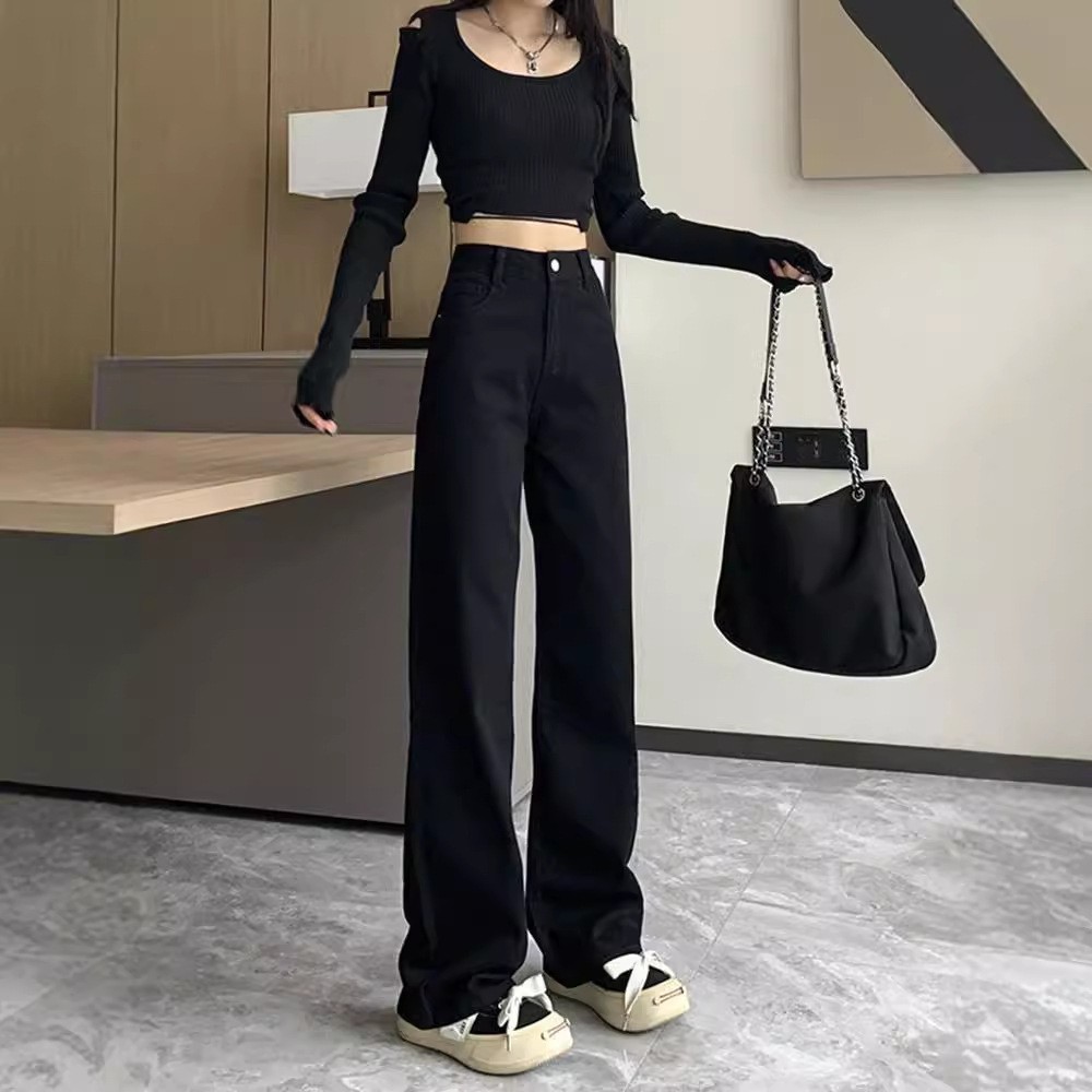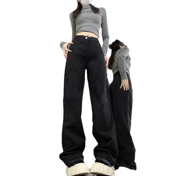 Главная страница > 2025 Весна/Лето Новые черные джинсы с высокой талией и широкими штанинами для женщин, прямые свободные брюки длиной до пола с драпировкой для миниатюрных размеров.