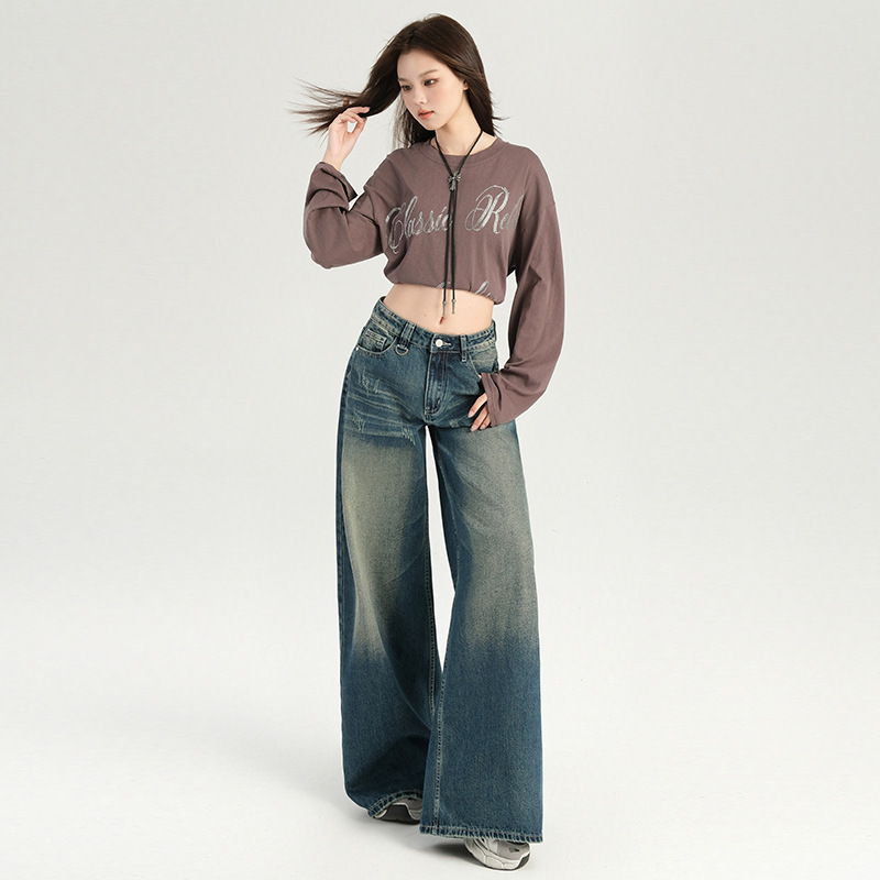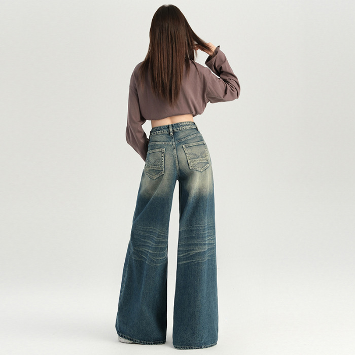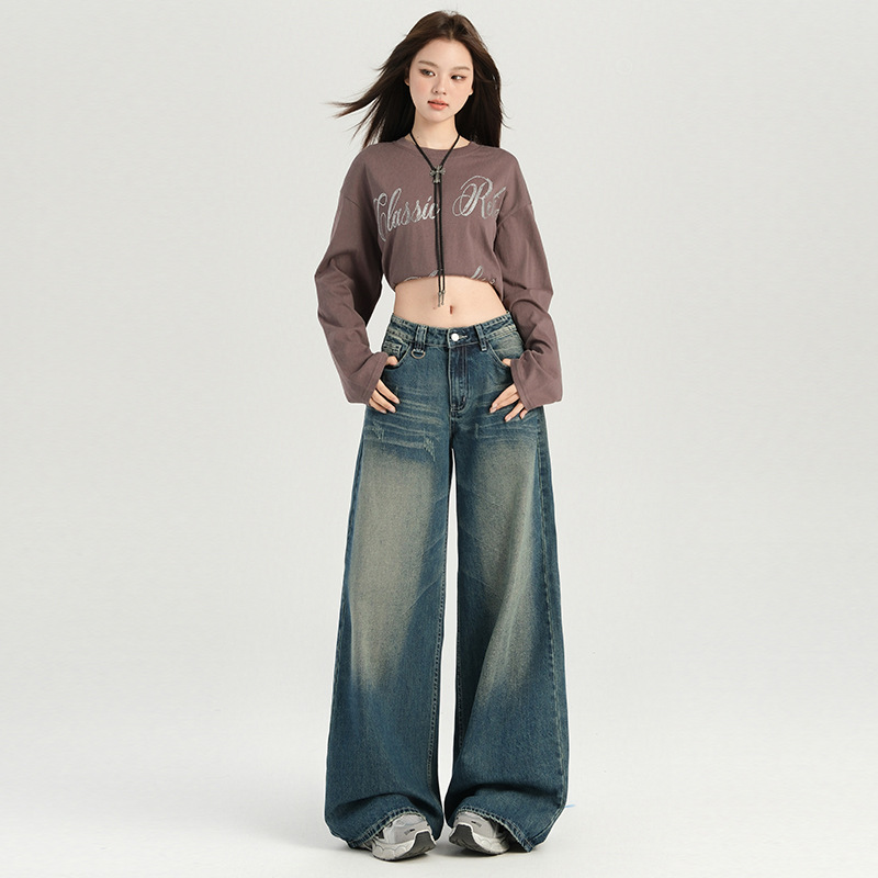 24 осень и зима новый zero дикий ретро мойка воды ленивый и расслабленная свободная широкая ножка джинсы женский