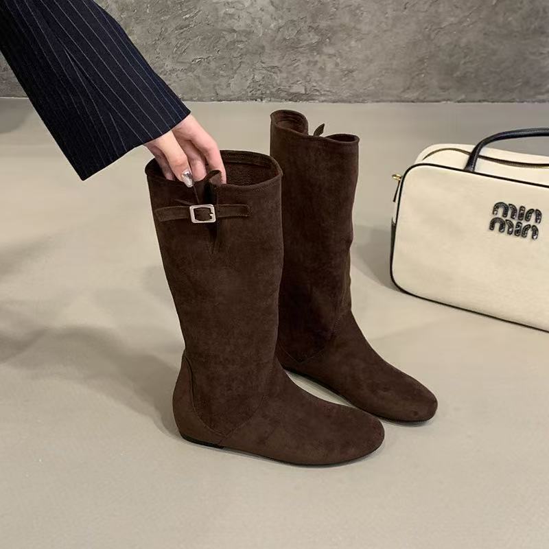 Модные замшевые ботинки средней длины в корейском стиле с круглым носком, универсальные, стройнящие, осень-зима 2025