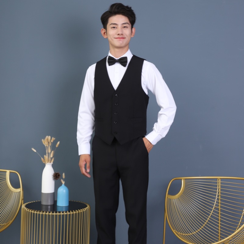 Черный жилет + брюки + белая рубашка с длинным рукавом