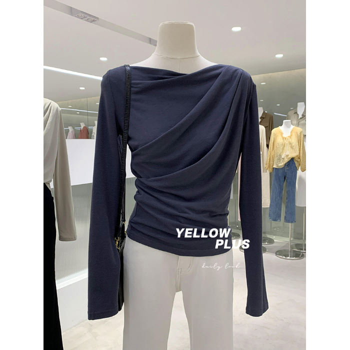 Главная страница > Женская базовая футболка из вискозы 260 г, элегантная, с открытыми плечами, плиссированная, в корейском стиле, с длинным рукавом, для весны и осени