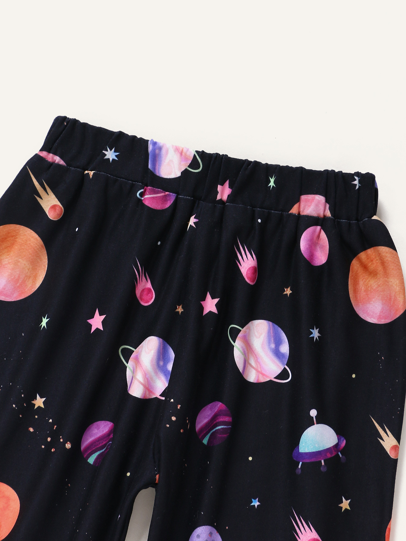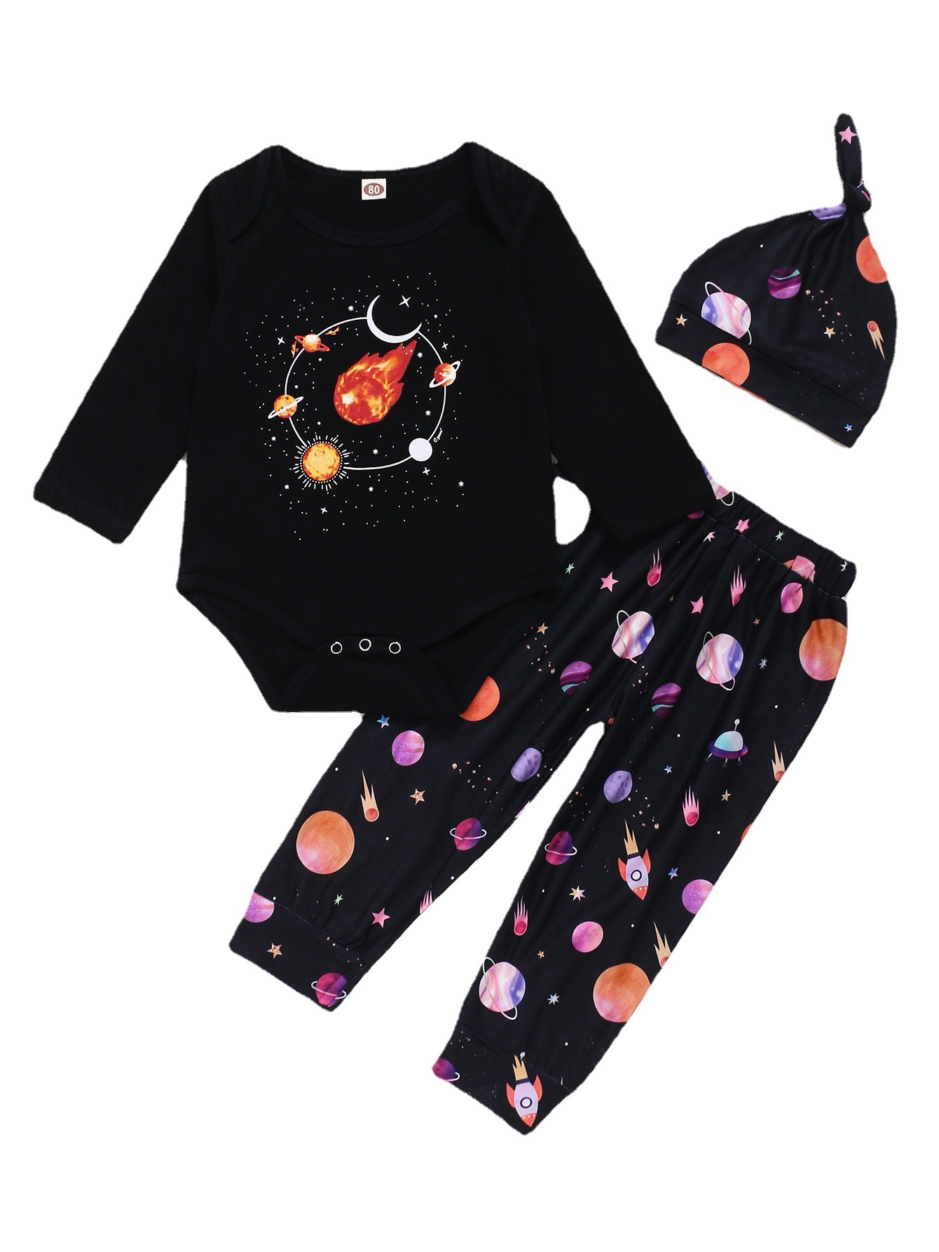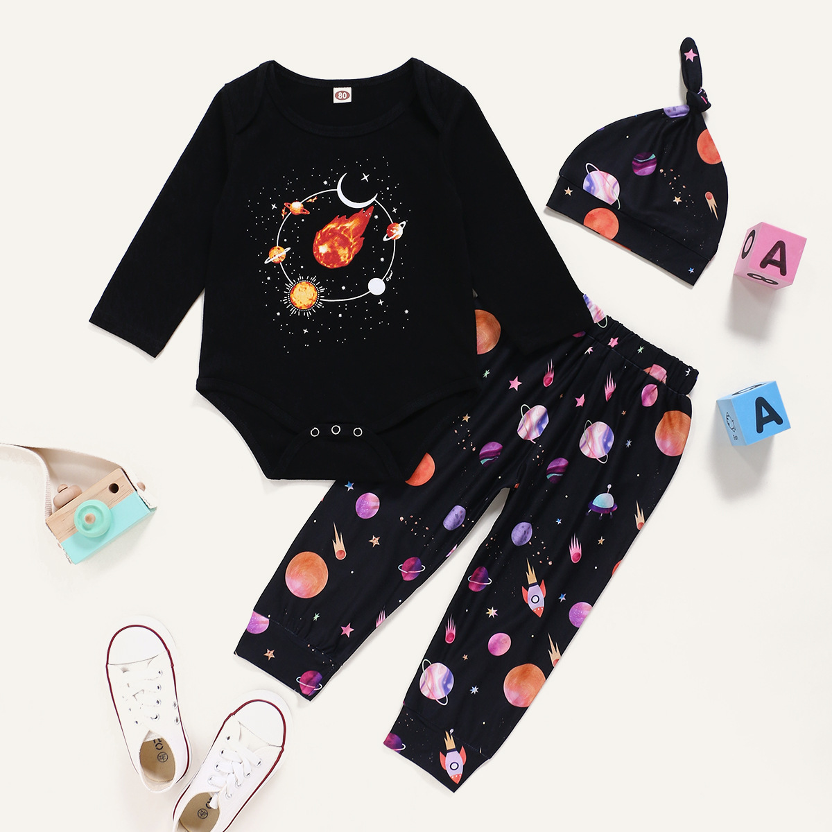 Главная страница > Фабричный набор из трех предметов: халат с длинными рукавами, брюки и шляпа с принтом "Черная планета" в стиле мультяшной анимации