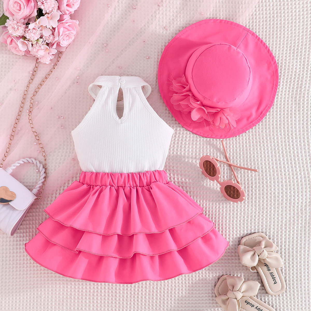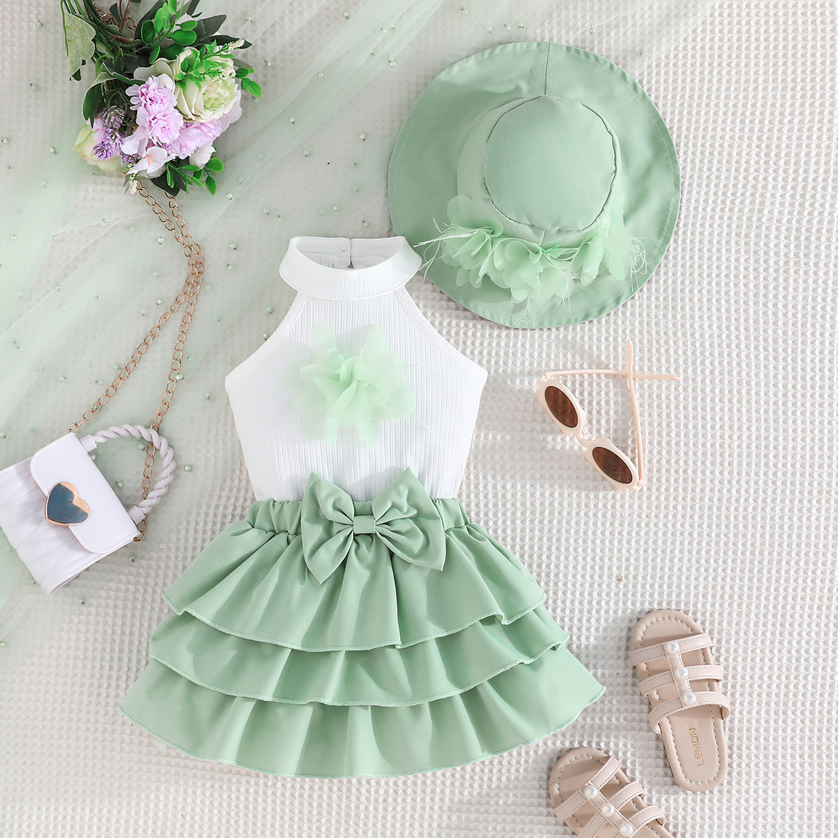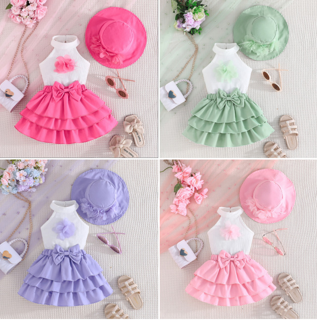 2025 трансграничный европейский и американский новый комплект для девочек: топ без рукавов однотонного цвета + юбка с цветочным принтом + шляпа, три предмета