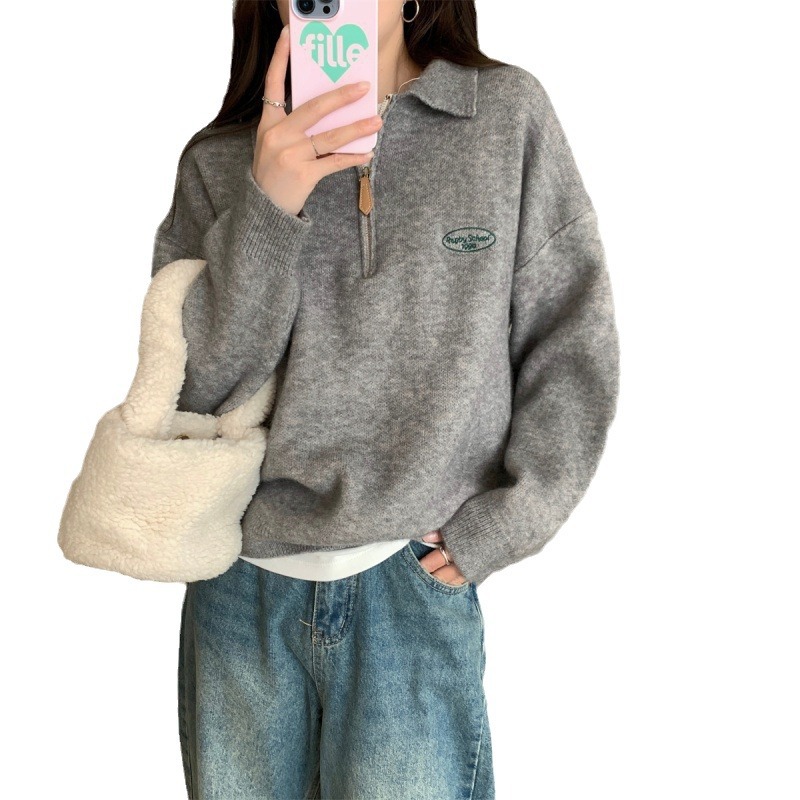 Главная страница > Новый воротник поло половина молния дизайн пуловер свитер Топ женские свободные пальто вышитые письмо утолщенные свитер