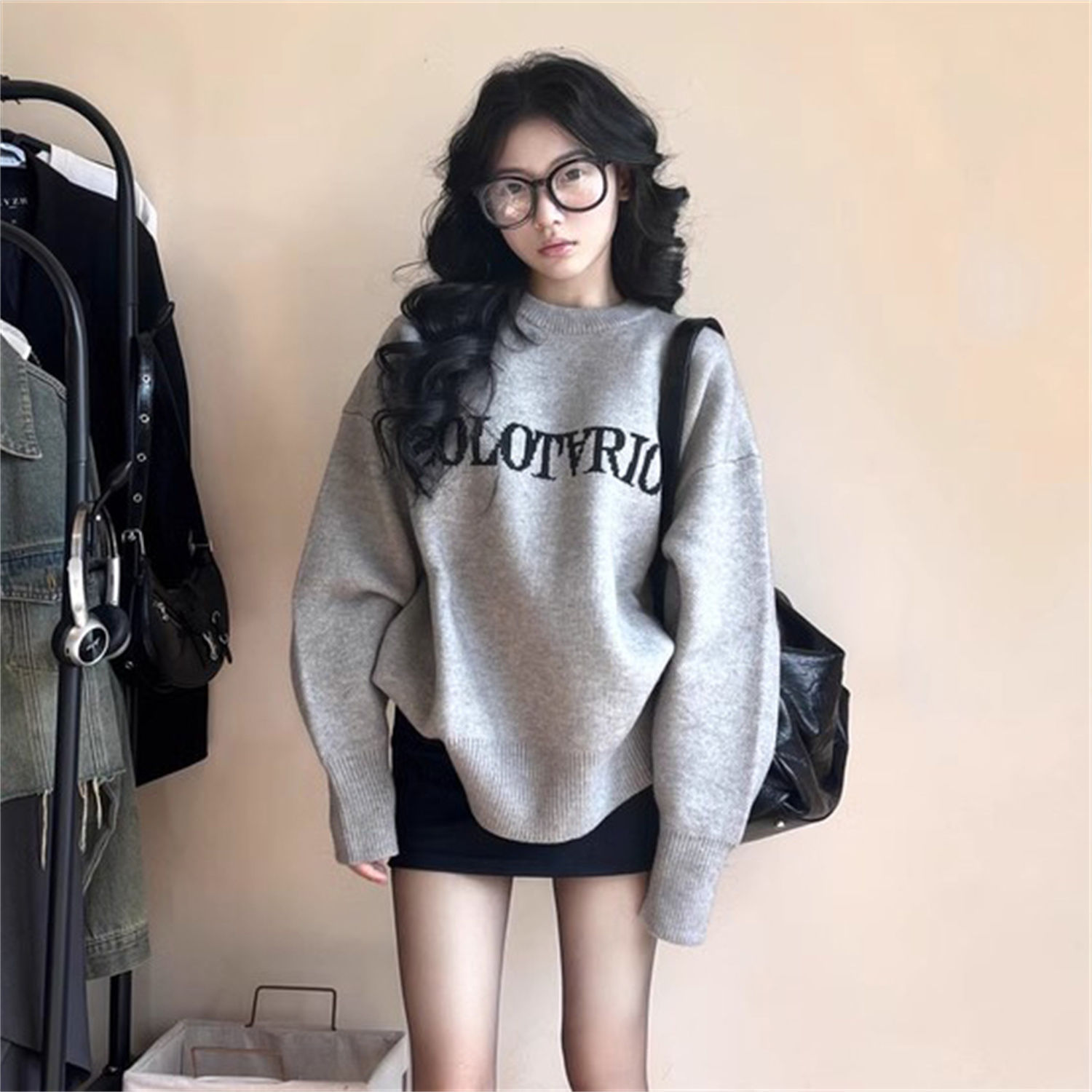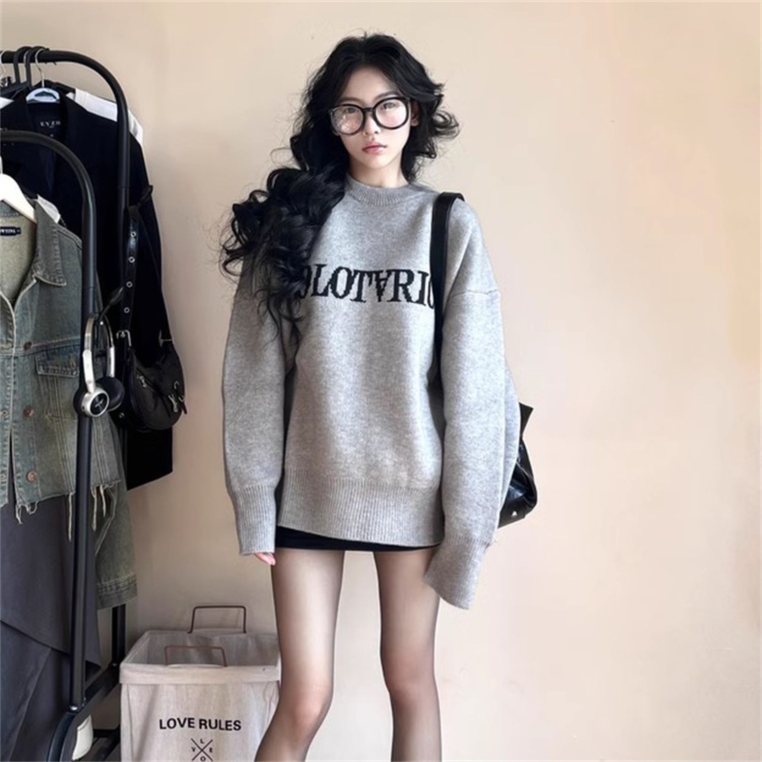 Серый свитер с буквенным принтом для женщин, осенне-зимний, свободный вязаный пуловер, повседневный универсальный стиль.